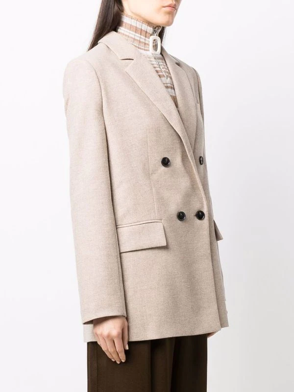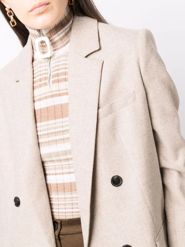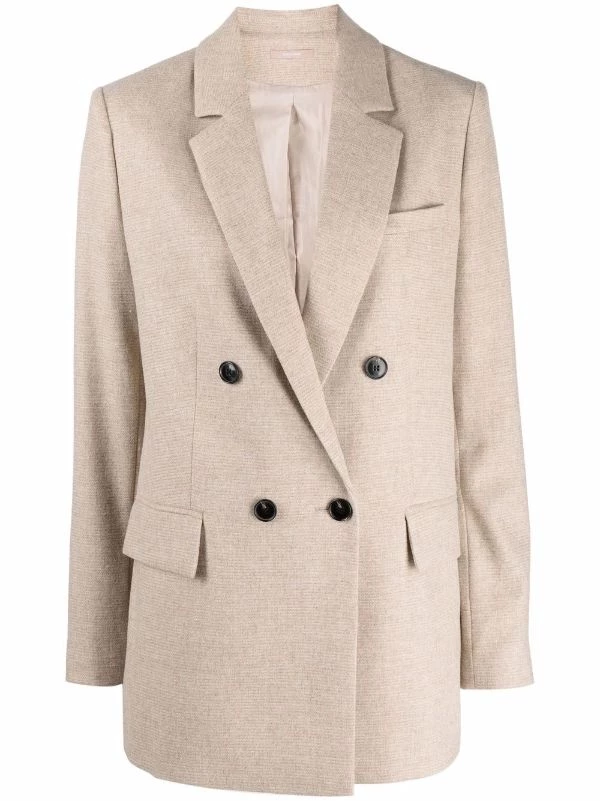 Revers classiques, boutonnière croisée, manches longues, poche passepoilée sur la poitrine, deux poches à rabat sur le devant. Matière : laine.