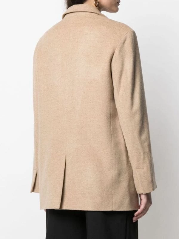 Design tricoté, pinces, détail de fente, larges revers pointus, poche passepoilée sur la poitrine, deux poches à rabat sur le devant, manches longues, doublure rayée. Matière : laine.