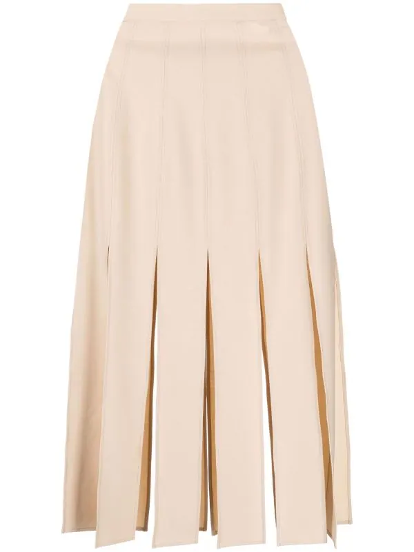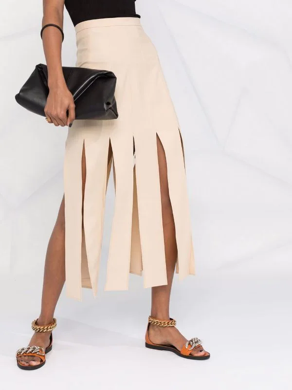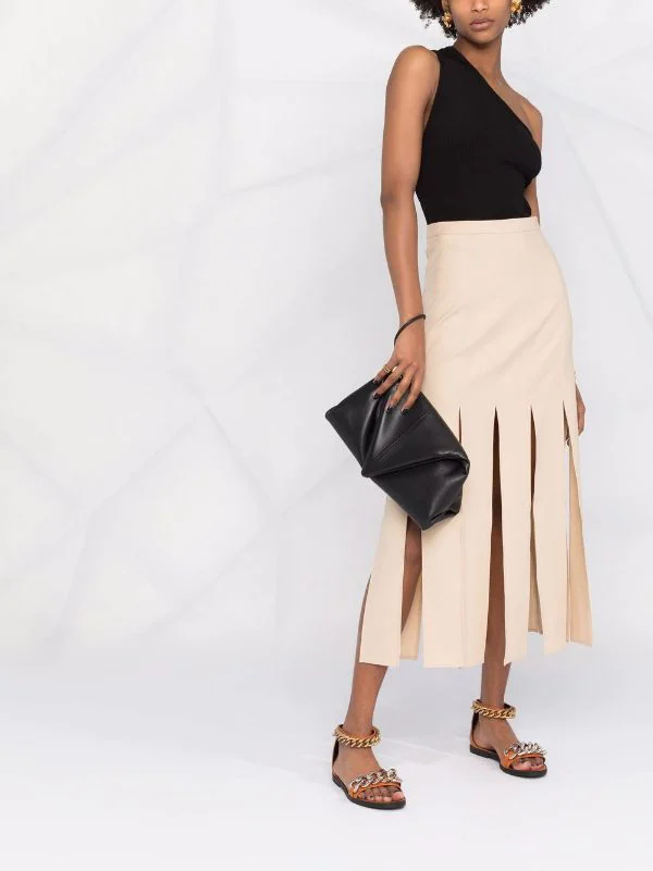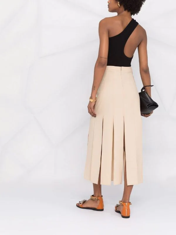 Détail de fente, jupe trapèze, taille haute, fermeture zippée à l’arrière.