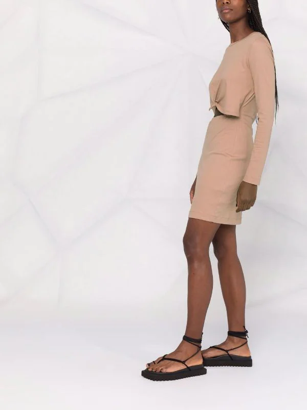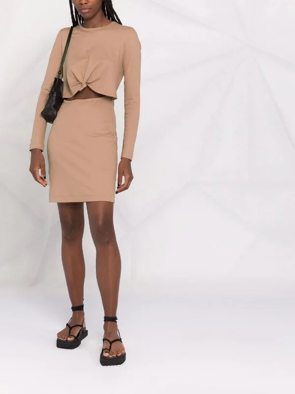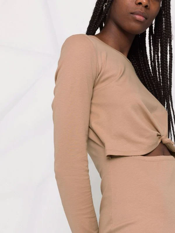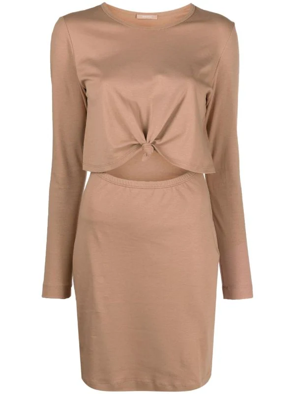Détail de nœud, détails de découpes, encolure ronde, manches longues, ourlet droit.