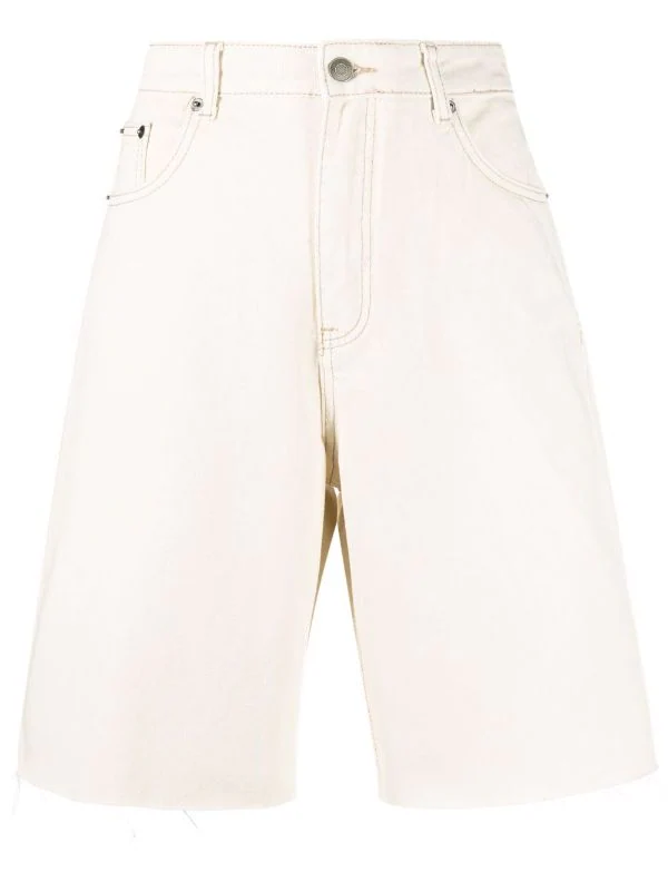 Taille haute, passants de ceinture, fermeture à zip et boutons sur le devant, cinq poches classiques, hauteur genou. Couleur : blanc. Matière : coton.
