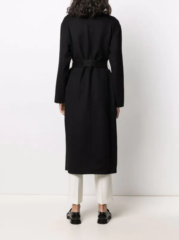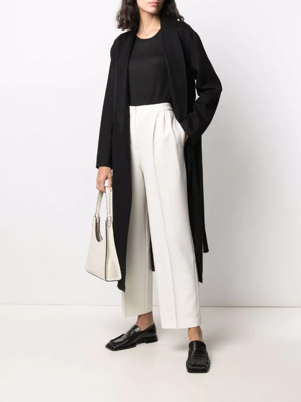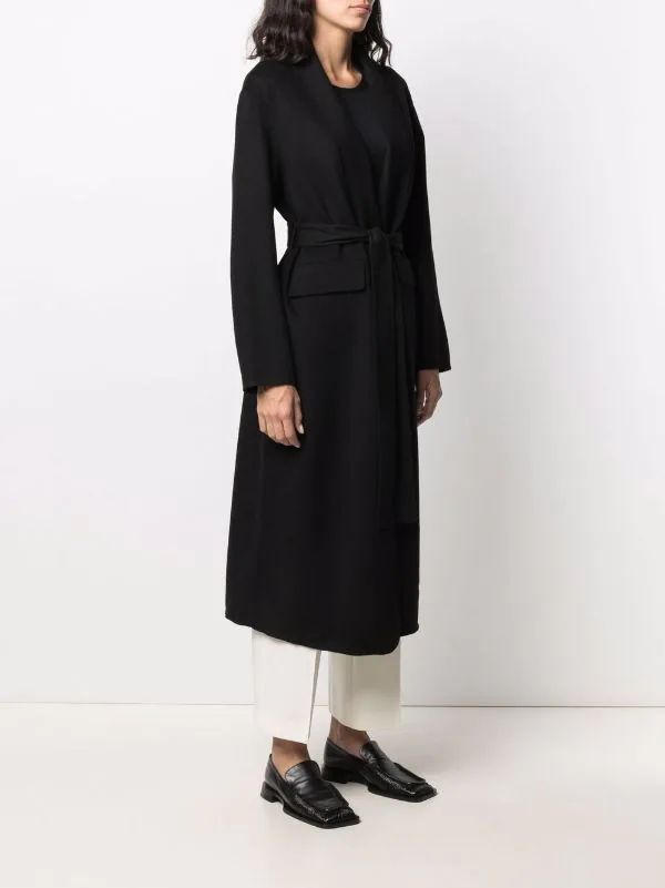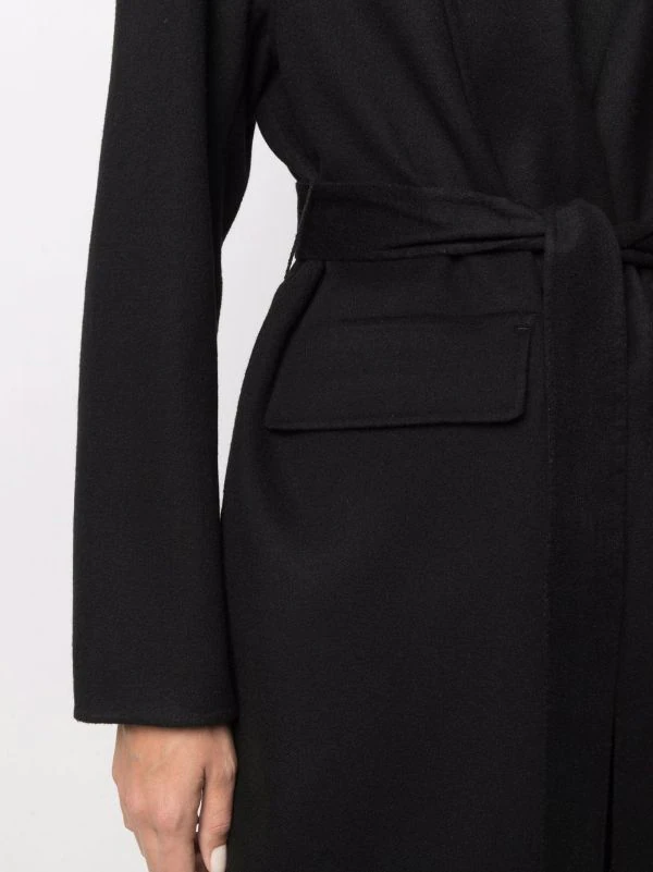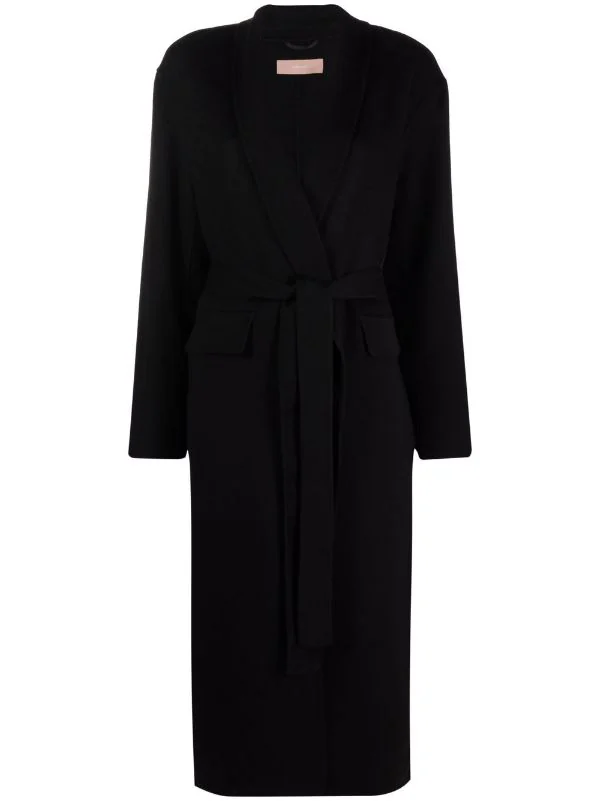 Design tricoté, col châle, taille nouée, passants de ceinture, poches devant à rabat, manches longues. Couleur : noir.