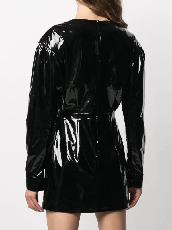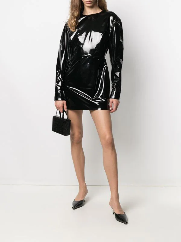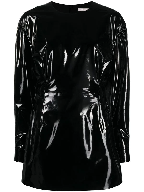 Fini brillant, détails de fronces, encolure ronde, manches longues. Couleur : Noir.