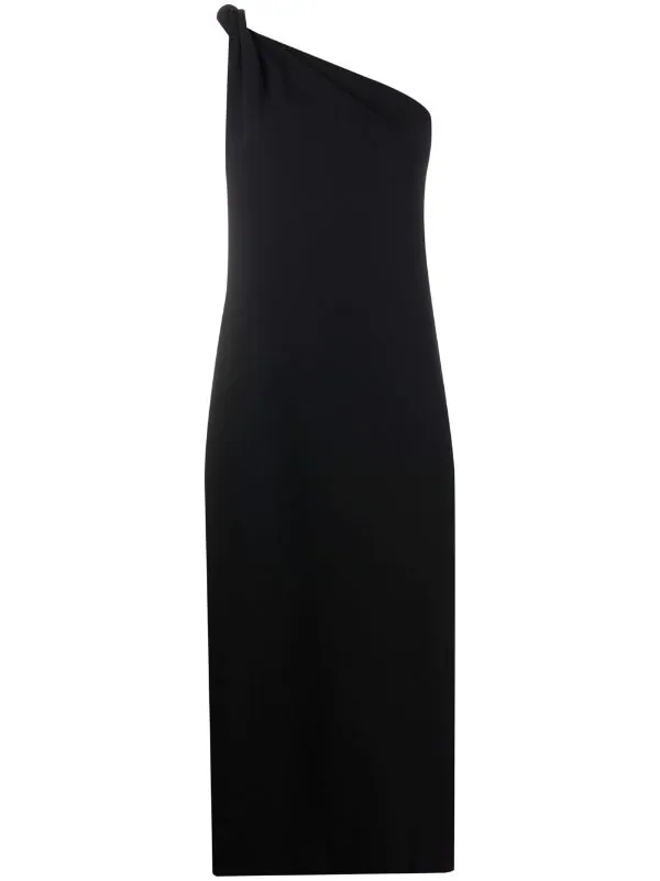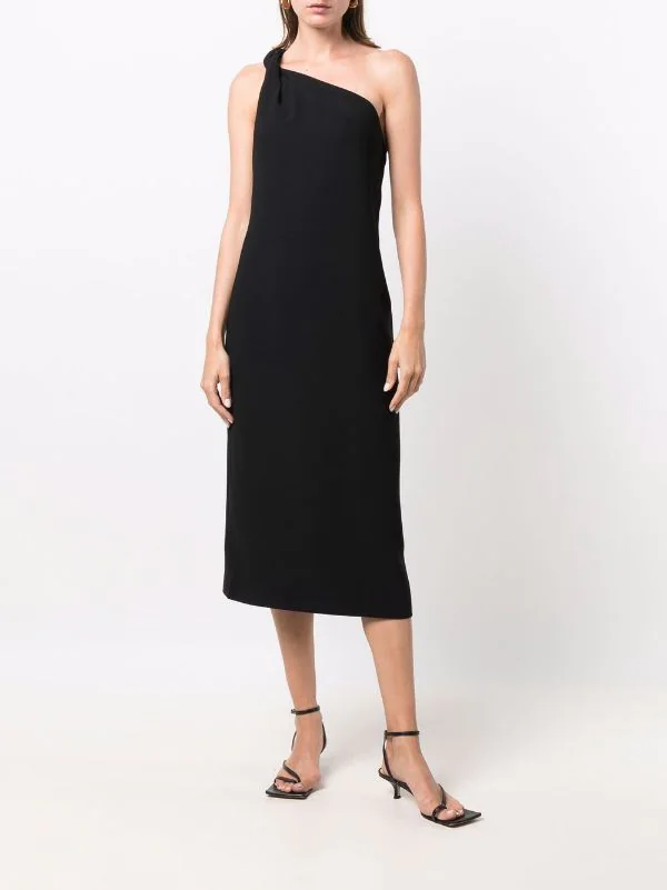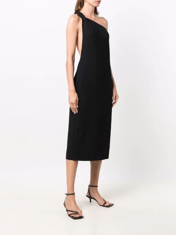 Encolure asymétrique, dos-nu, coupe évasée, coupe mi-longue. Couleur : noir.