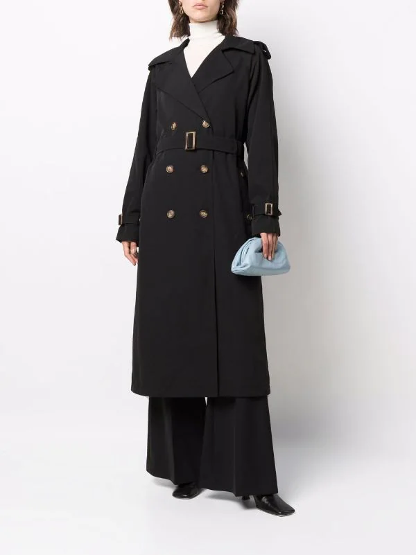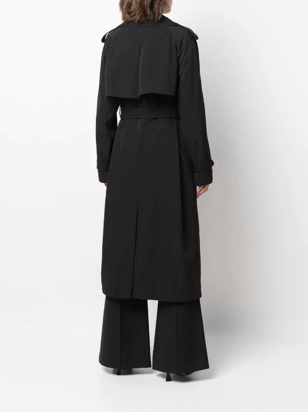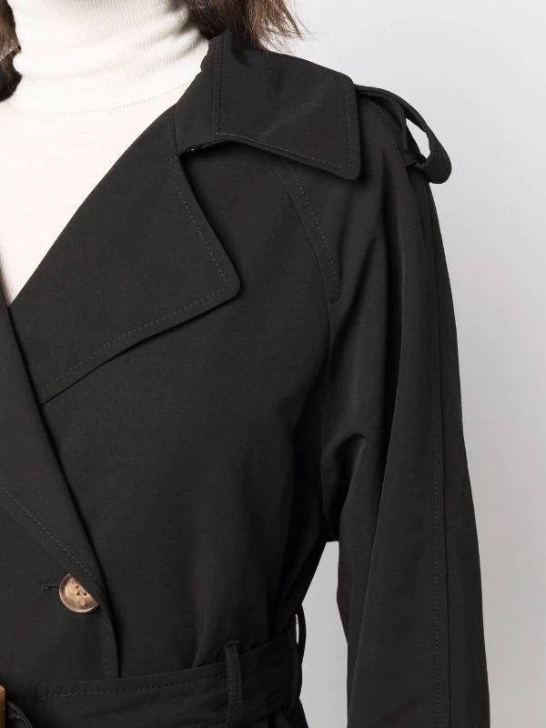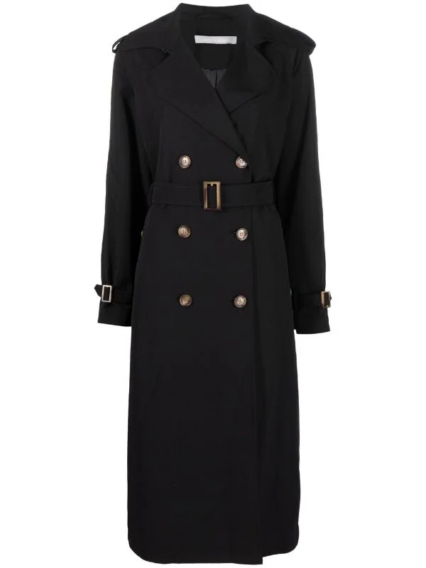Boutonnière croisée, taille ceinturée, longueur au dessous du genou, manches à poignets resserrés. Couleur : noir.