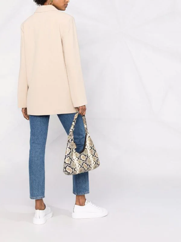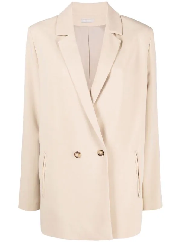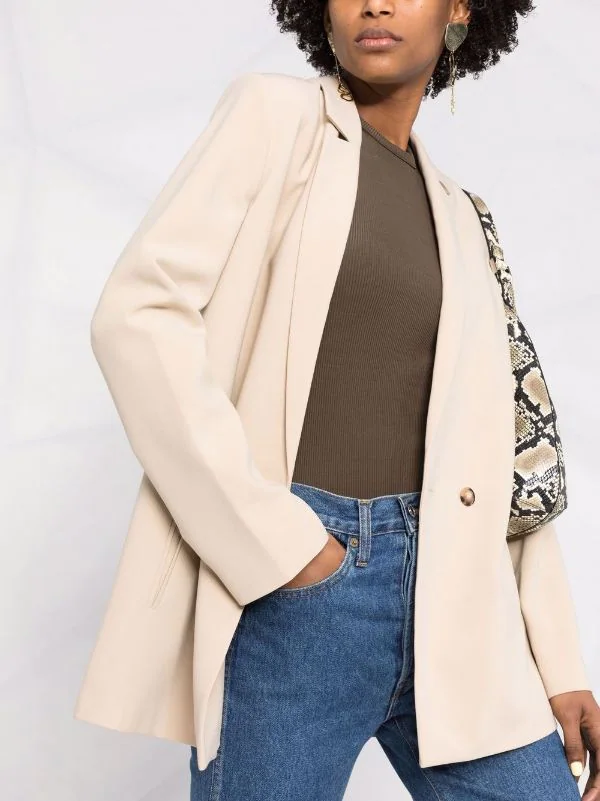 Revers crantés, boutonnière croisée, manches longues, deux poches latérales fendues, ourlet droit.