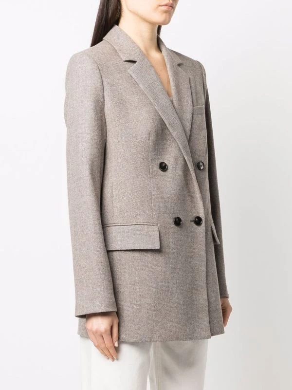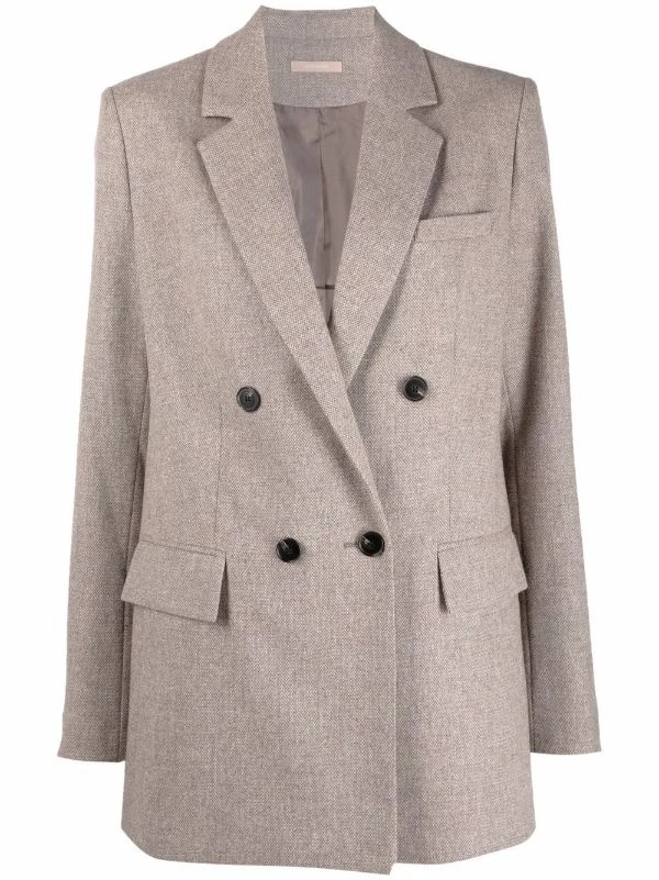 Revers classiques, boutonnière croisée, manches longues, poche passepoilée sur la poitrine, deux poches à rabat sur le devant. Matière : laine.