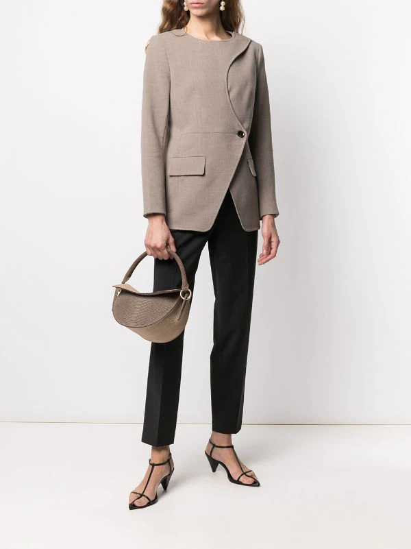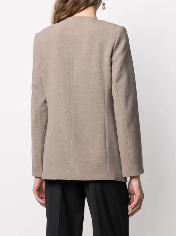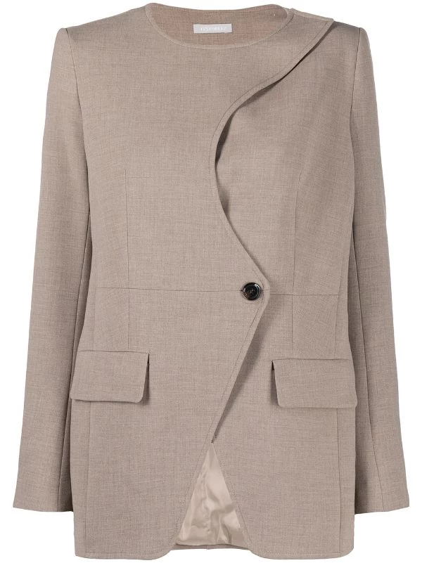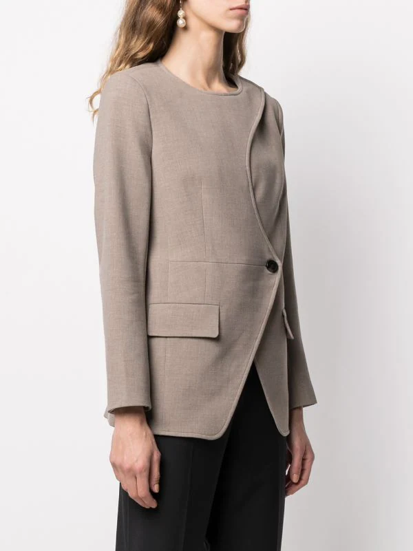 Encolure ronde, boutonnière décalée sur le devant, deux poches plaquées avant, manches longues, ourlet droit.