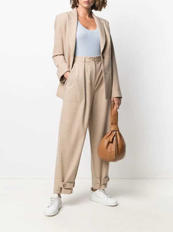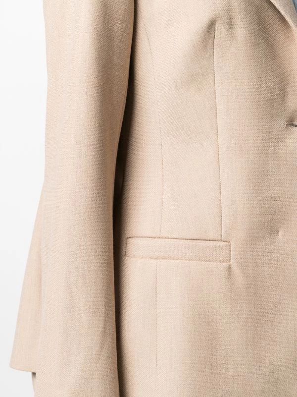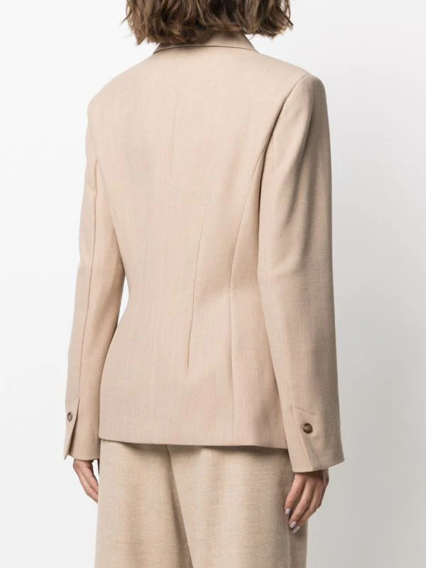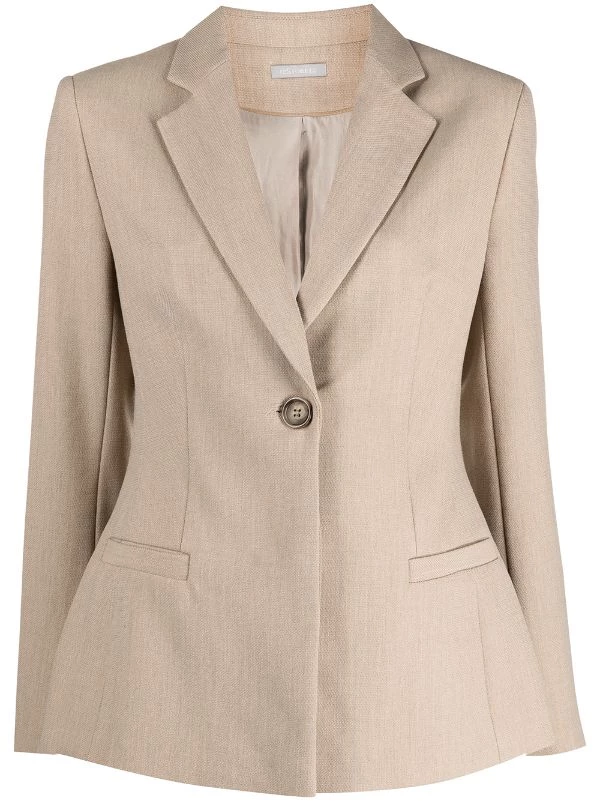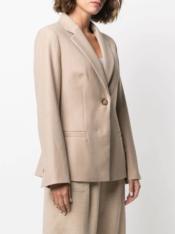 Pinces, deux poches latérales passepoilées, boutonnière sur le devant, revers crantés, manches longues, ourlet droit.