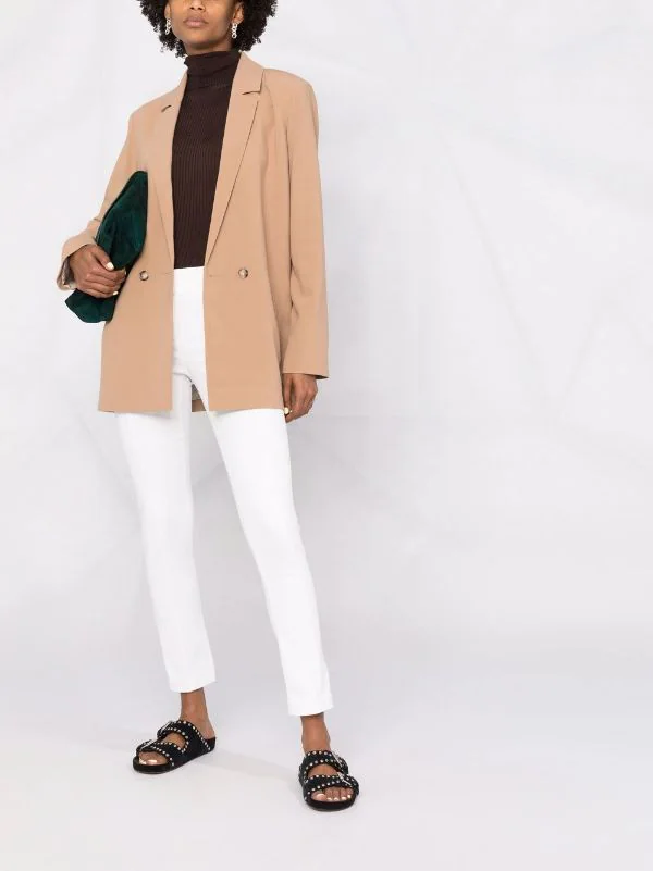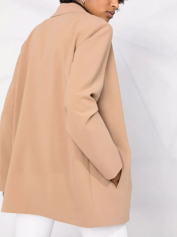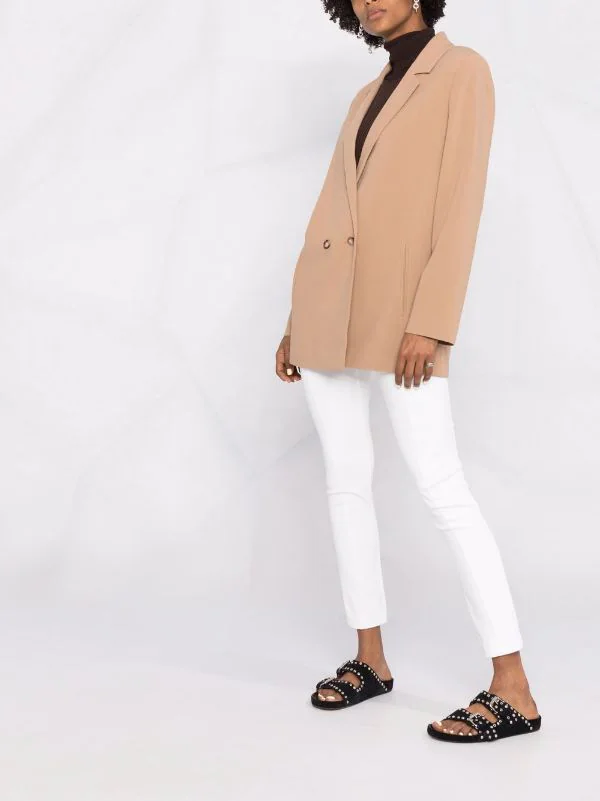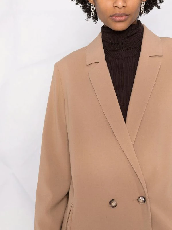 Revers crantés étroits, boutonnière croisée, manches longues, deux poches latérales fendues, ourlet droit.