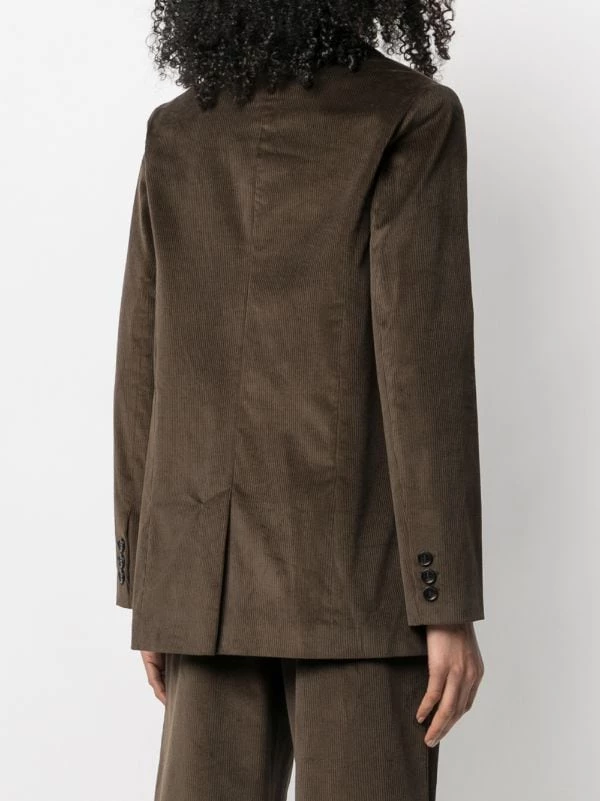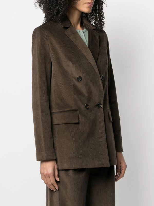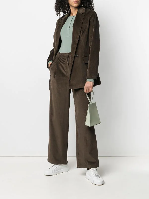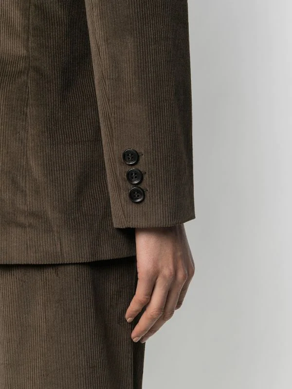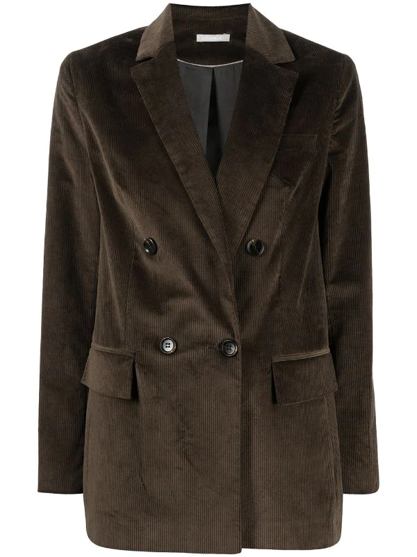 Revers crantés, boutonnière croisée, manches longues, poignets boutonnés, poches devant à rabat, fente arrière.