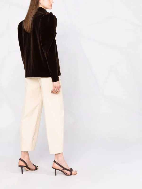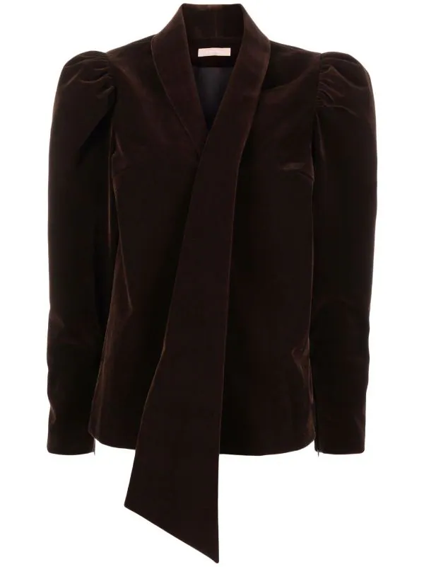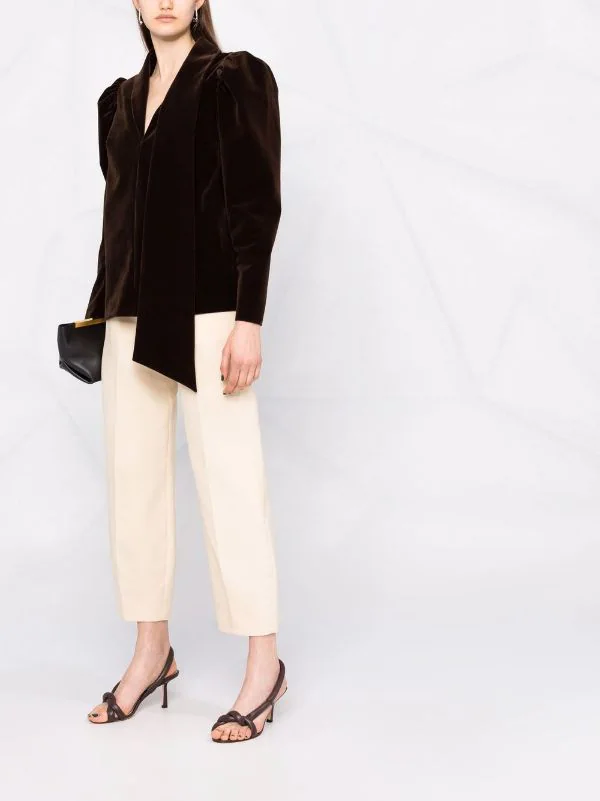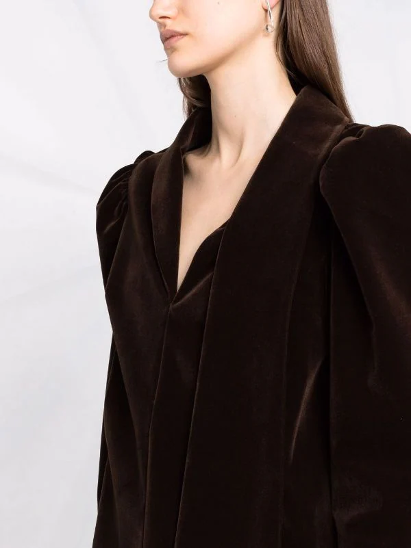 Col v, manches bouffantes longues, détail de foulard, ourlet droit. Matière : velours.
