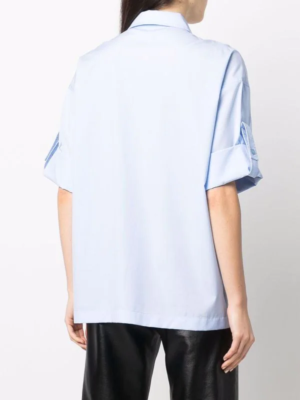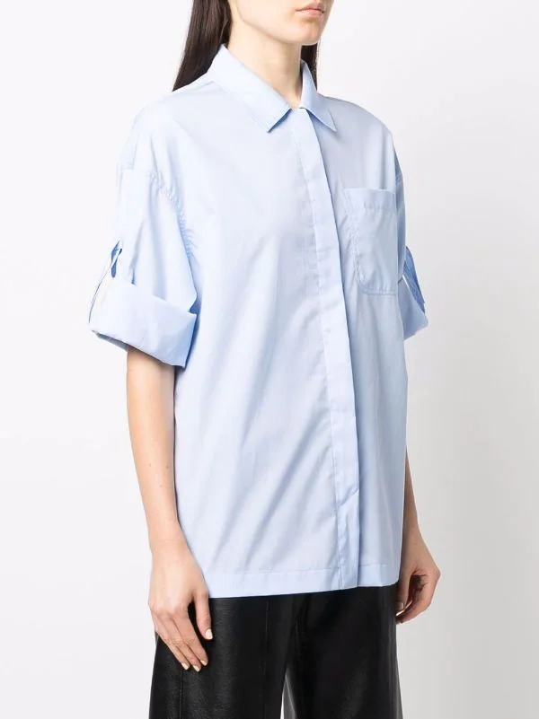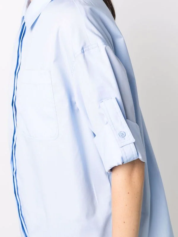 Col classique, fermeture dissimulée sur le devant, ourlet droit, manches longues amples, poche poitrine plaquée. Couleur : bleu. Matière : coton.