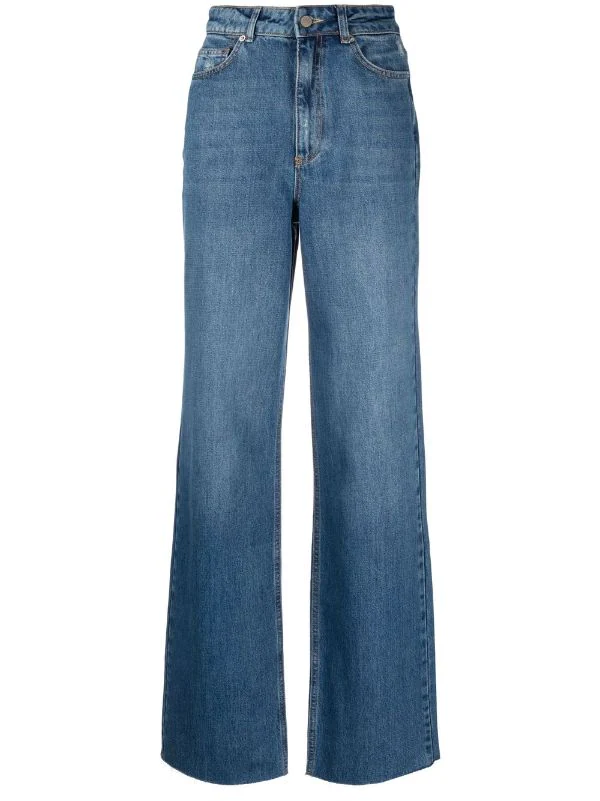 Effet délavé, passants de ceinture, taille haute, coupe ample, cinq poches classiques. Couleur : bleu. Matière : coton.