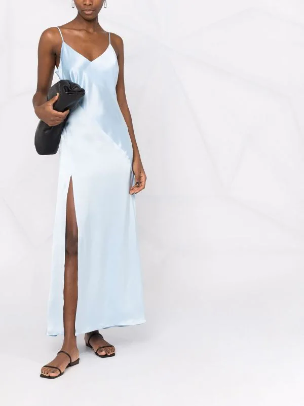 Fines bretelles, col v, détails de coutures apparentes, fente latérale, forme nuisette, hauteur cheville. Matière : soie.