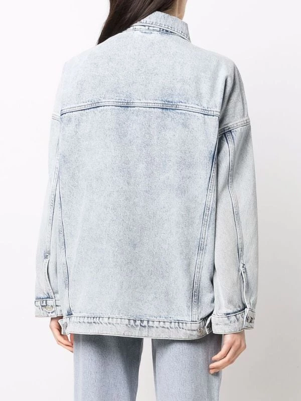 Bleu clair, coton, effet légèrement délavé, col classique, boutonnière sur le devant, manches longues, poignets boutonnés, deux poches poitrine à rabat, deux poches latérales fendues, ourlet droit.