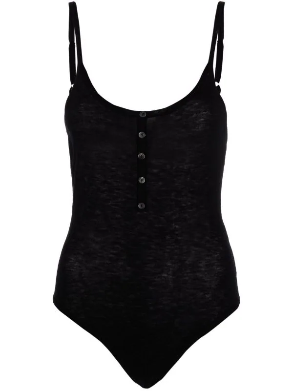 Bretelles fines, encolure arrondie, boutonnière sur le devant, décolleté arrondi dans le dos. Couleur : noir.