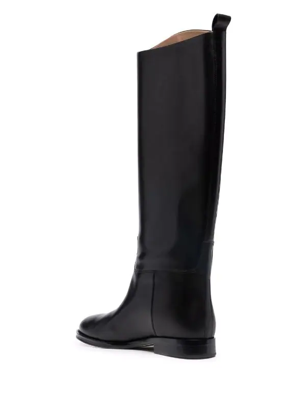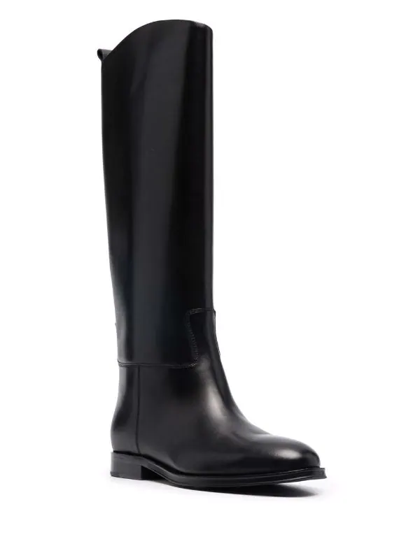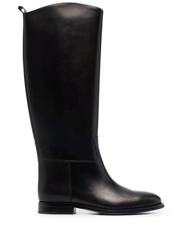 Hauteur genou, bout rond, fini poli, languette d’enfilage au talon. Couleur : noir. Matière : cuir.