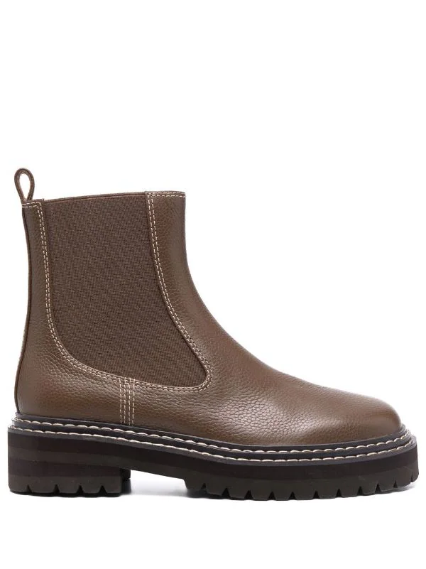 Bout rond, hauteur cheville, semelle plate. Couleur : marron.