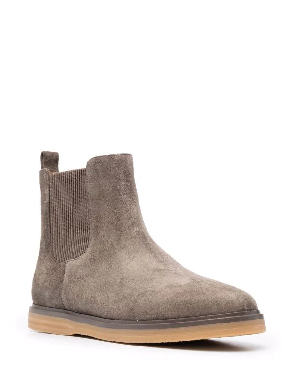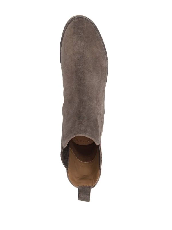 Bout rond, empiècements élastiqués sur les côtés, languette d’enfilage au talon, semelle en caoutchouc. Couleur : marron. Matière : daim.