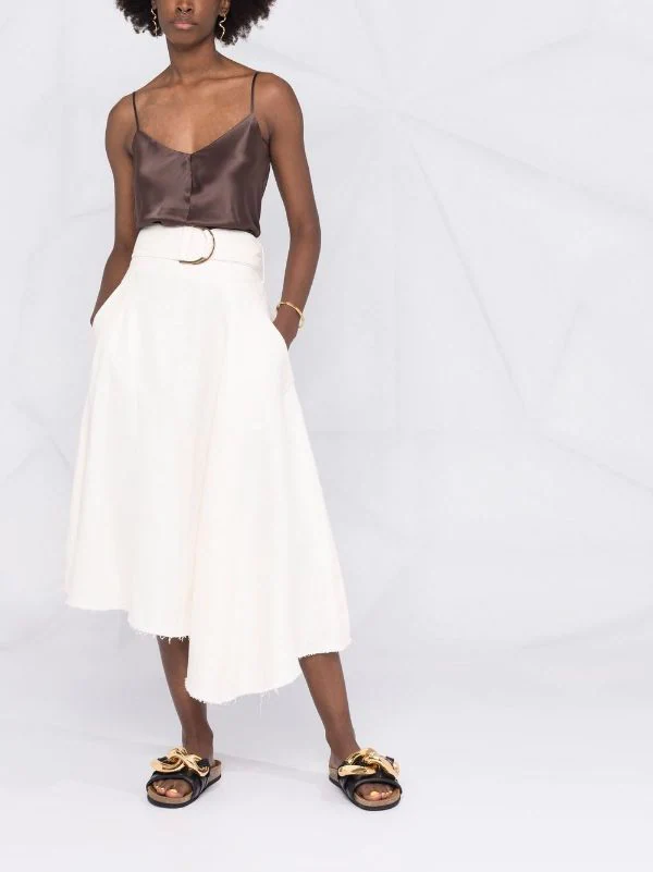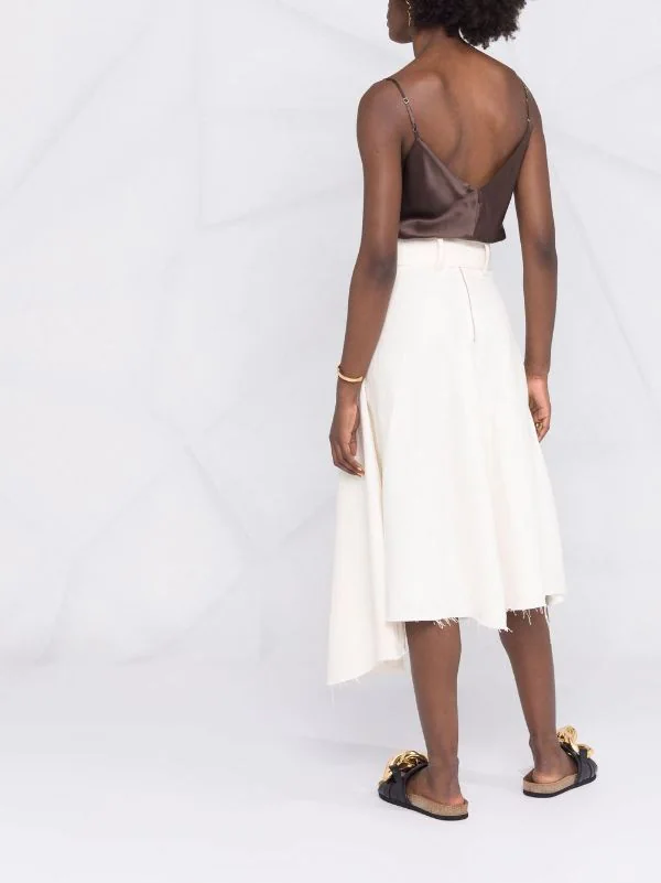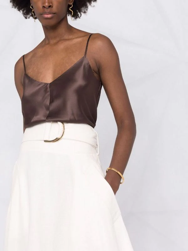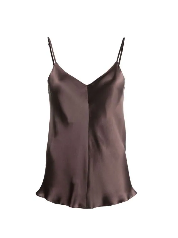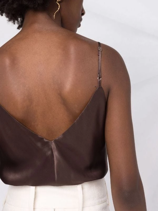 Fines bretelles, col v, col v au dos, ourlet droit. Couleur : marron. Matière : soie.