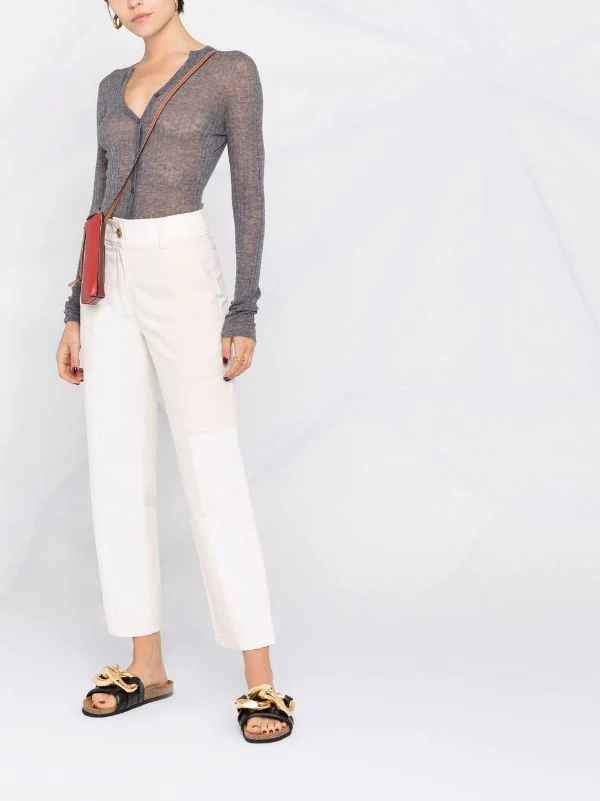 Effet de transparence, maille nervurée, coupe slim, boutonnière sur le devant, manches longues. Couleur : gris. Matière : mérinos.