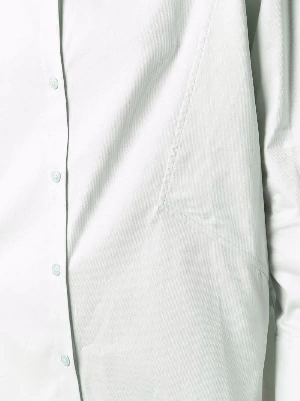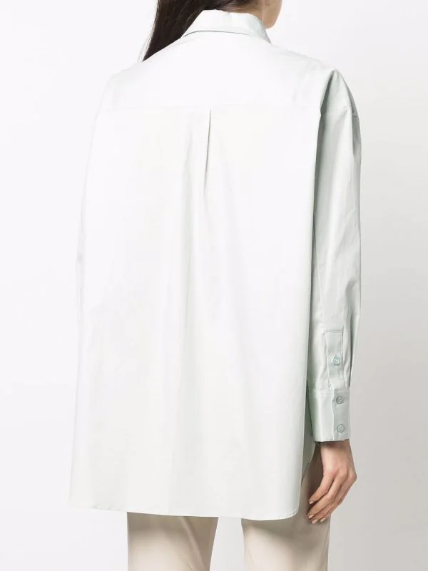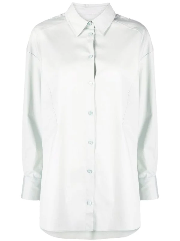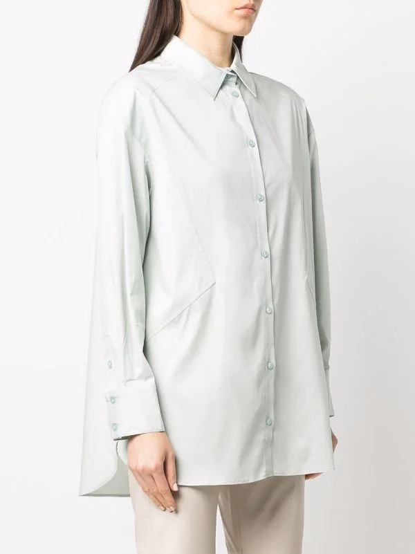 Col pointu, boutonnière sur le devant, manches longues, poignets boutonnés, ourlet incurvé.