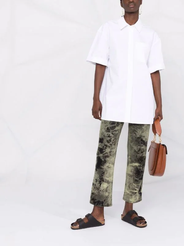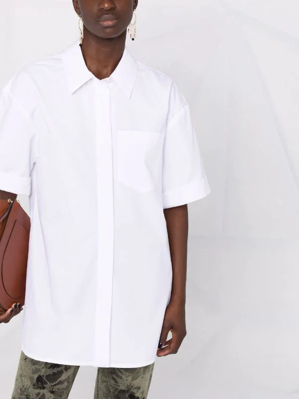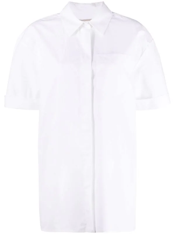 Col classique, fermeture dissimulée sur le devant, manches roulottées courtes, ourlet droit. Couleur : blanc. Matière : coton.