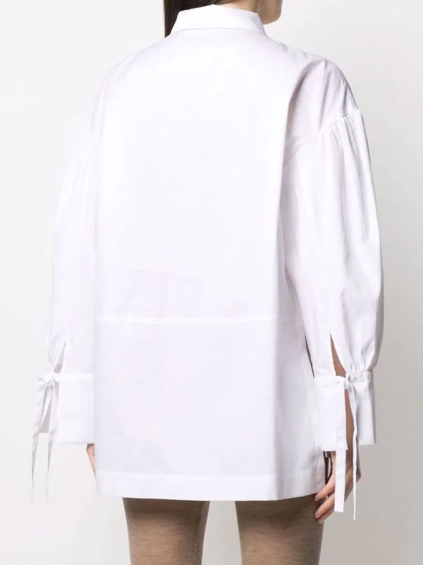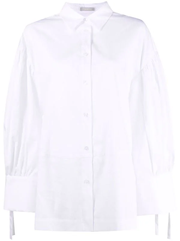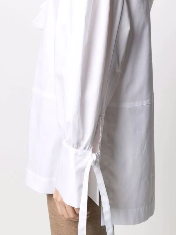 Poignets noués, col classique, boutonnière sur le devant, manches longues, ourlet droit. Couleur : blanc. Matière : coton.