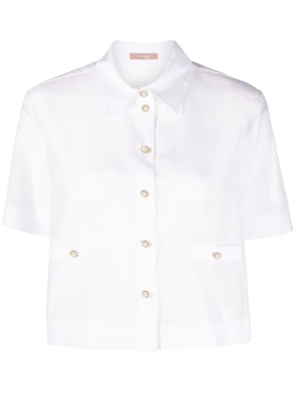 Col classique, boutonnière en nacre, à détail de fausse poche, manches courtes, coupe courte. Couleur : blanc.