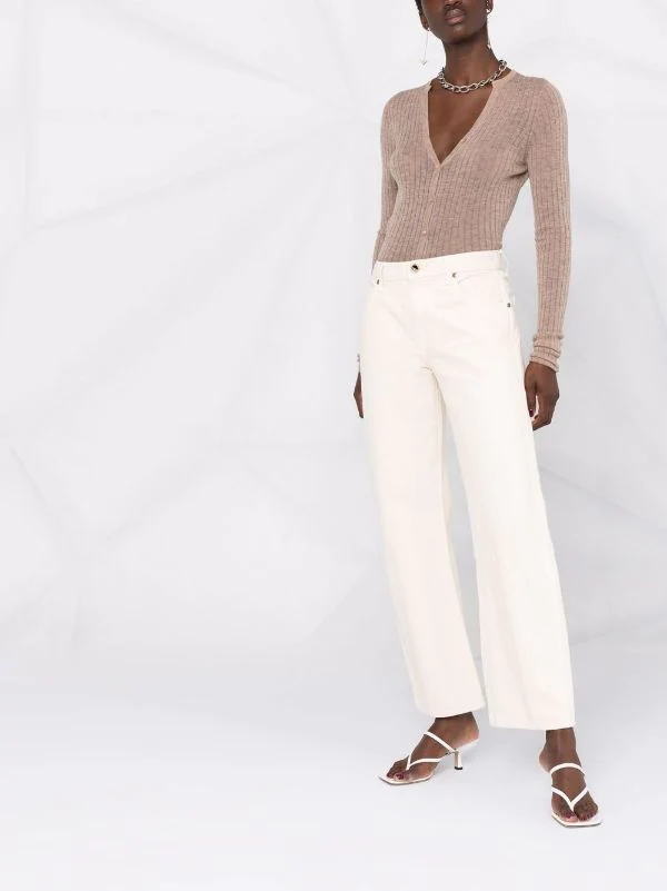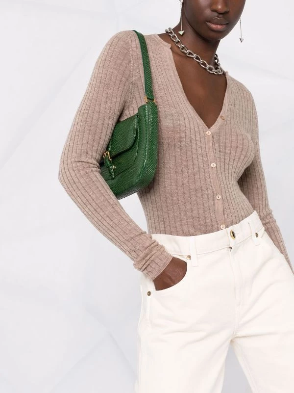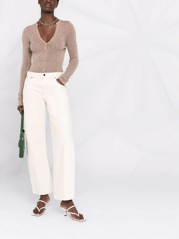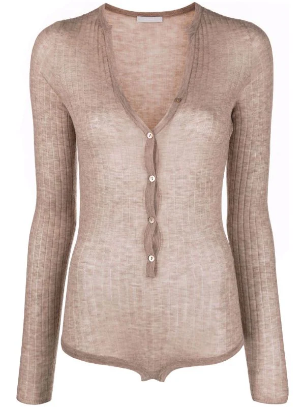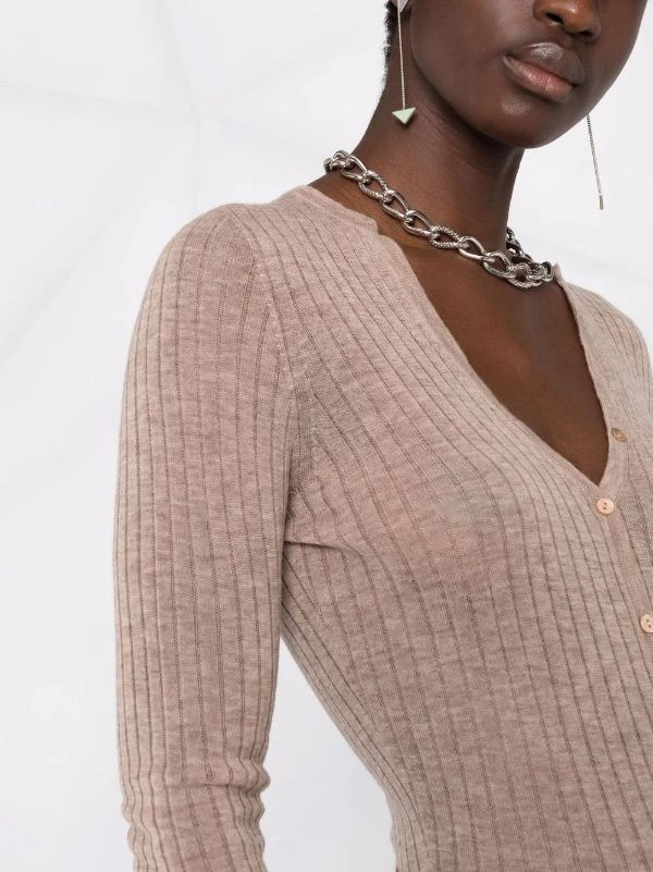 Maille nervurée, coupe slim, boutonnière sur le devant, manches longues. Matière : mérinos.