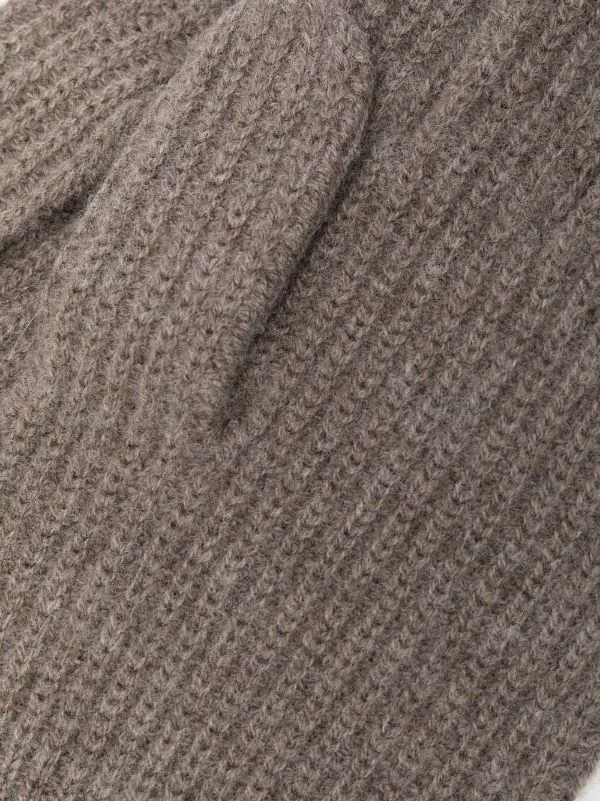 Design en maille, design à enfiler, ourlet nervuré. Couleur : marron. Matière : laine mérinos.