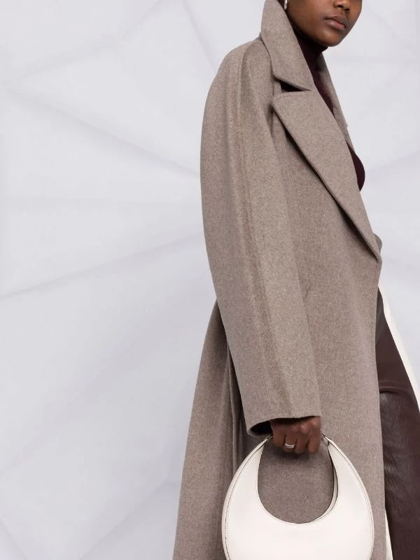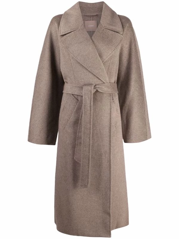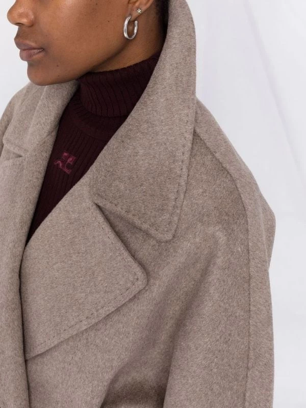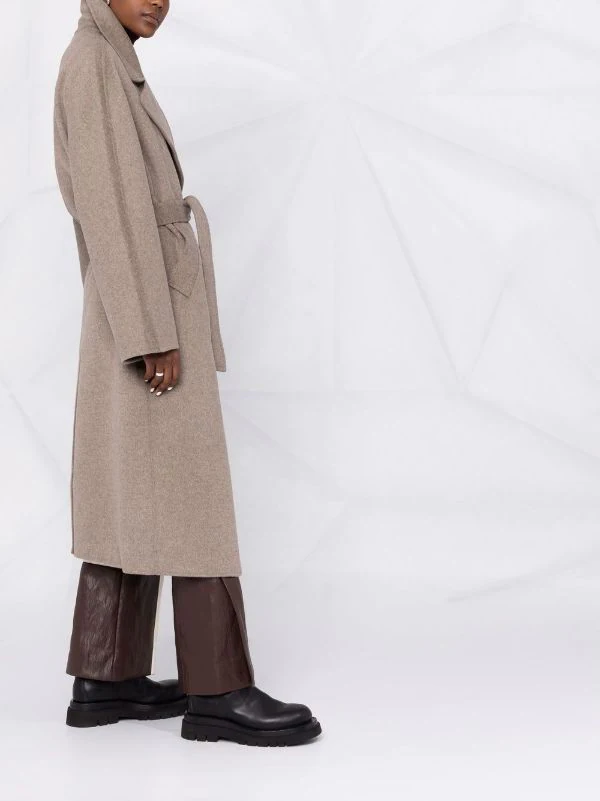 Taille ceinturée, revers classiques, manches longues, coupe mi-longue. Couleur : marron.