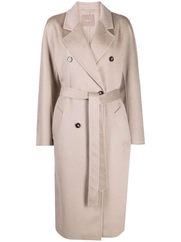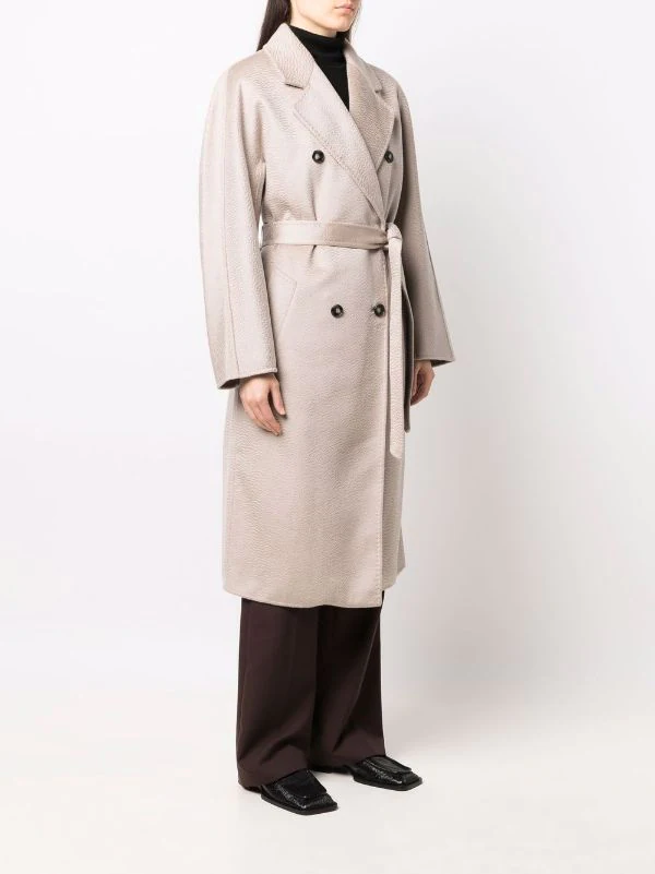 Boutonnière croisée, taille ceinturée, manches longues, poches latérales fendues. Matière : cachemire.