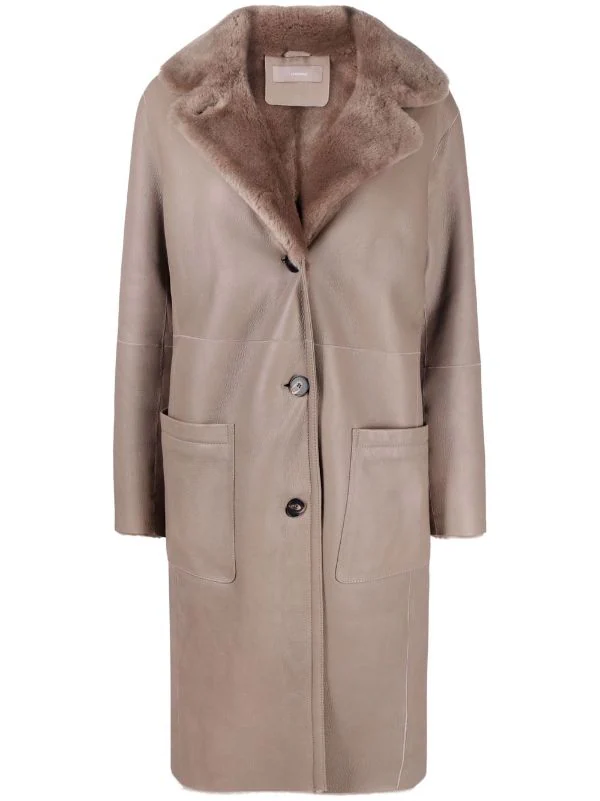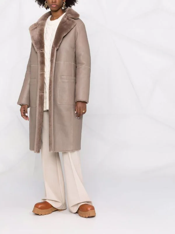 Revers crantés, deux poches plaquées avant, boutonnière sur le devant, manches longues. Matière : peau de mouton.