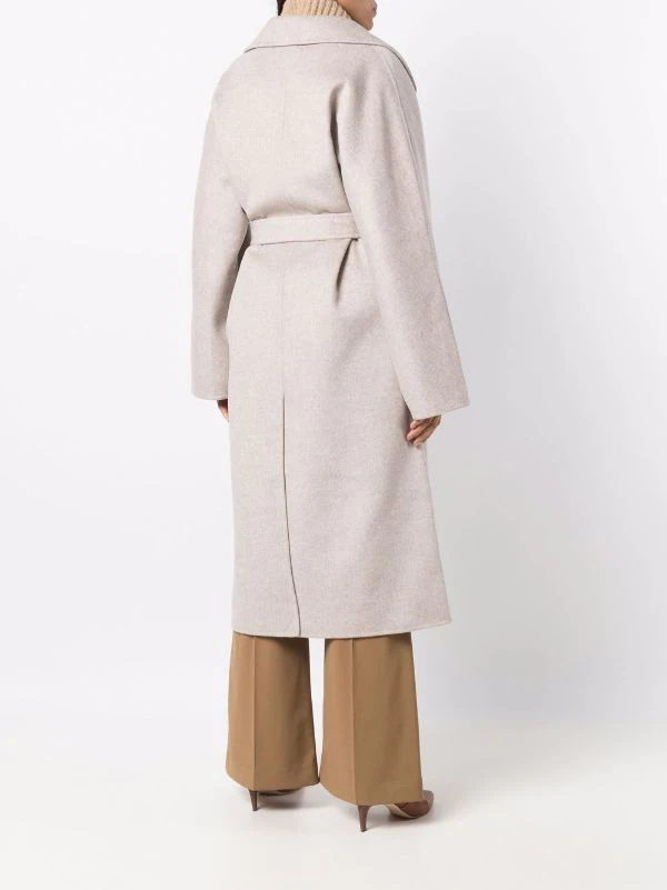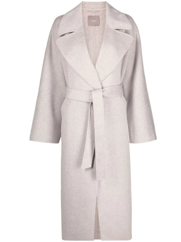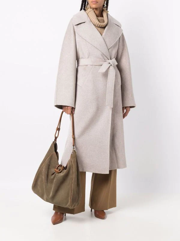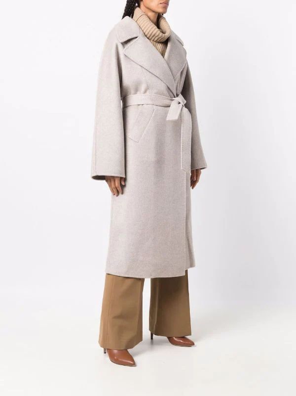 Larges revers crantés, taille ceinturée, manches longues amples, poches latérales fendues.