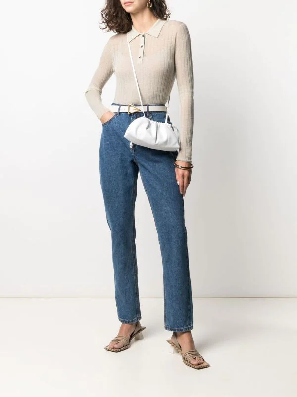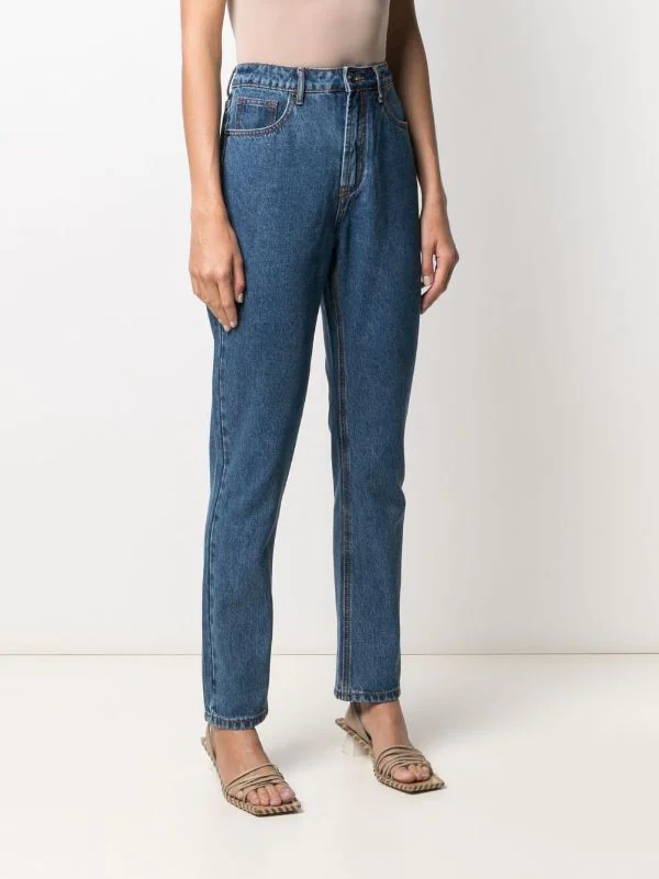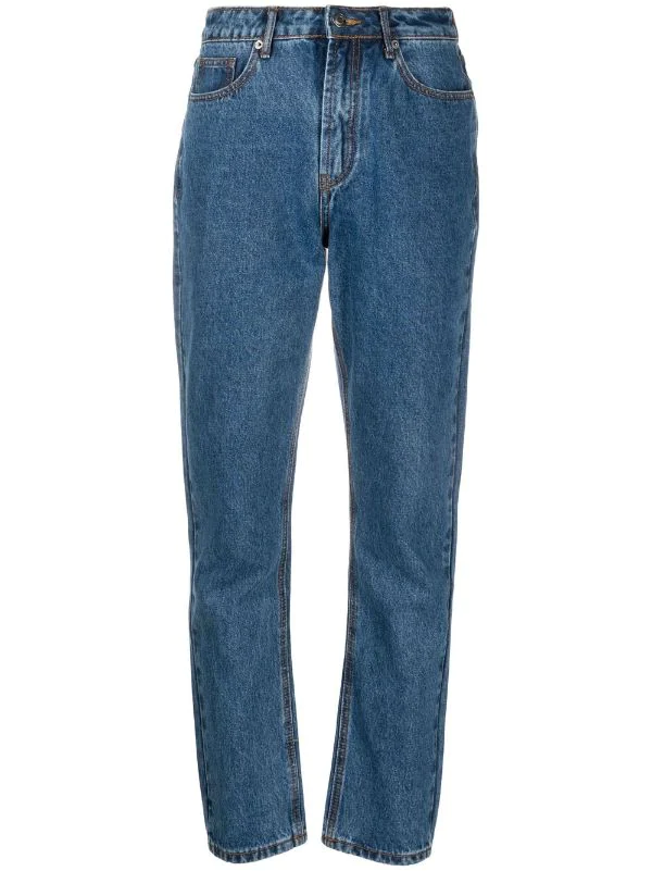 Coupe droite, taille haute, fermeture boutonnée, passants de ceinture, cinq poches classiques. Matière : coton.