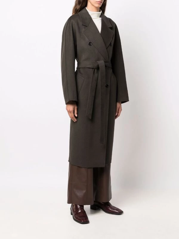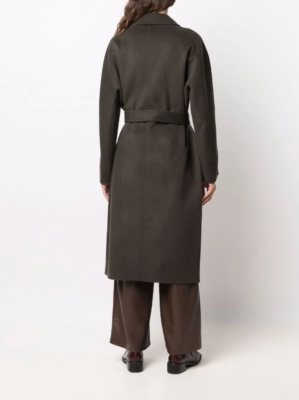 Kaki, revers crantés, boutonnière croisée, manches longues, taille nouée, deux poches latérales fendues, coupe mi-longue.
