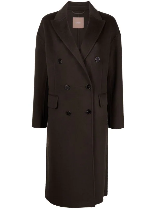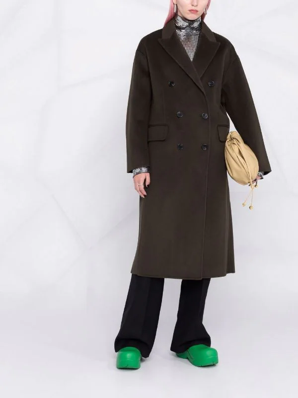 Revers pointus, épaules tombantes, boutonnière croisée, manches longues, deux poches à rabat sur le devant, hauteur genou.