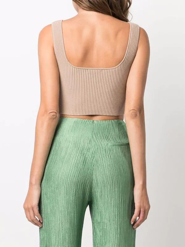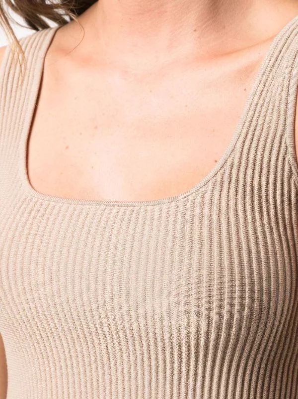 Maille nervurée, encolure carrée, design sans manches, coupe courte.