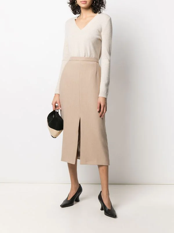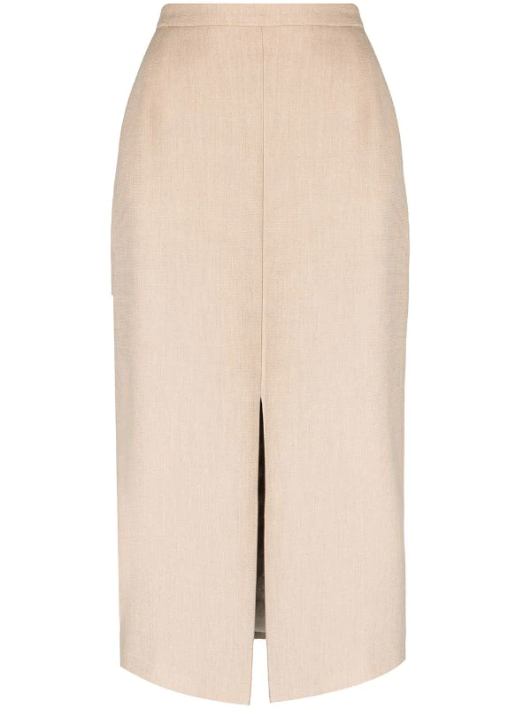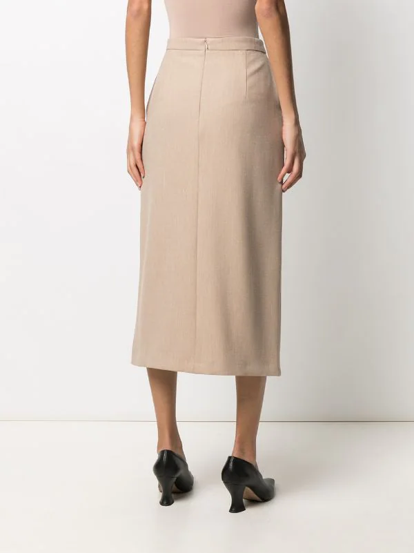 Taille haute, deux poches latérales passepoilées, fente sur le devant, doublure intégrale, fermeture zippée à l’arrière.
