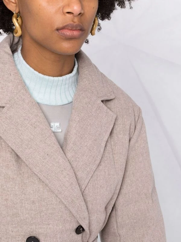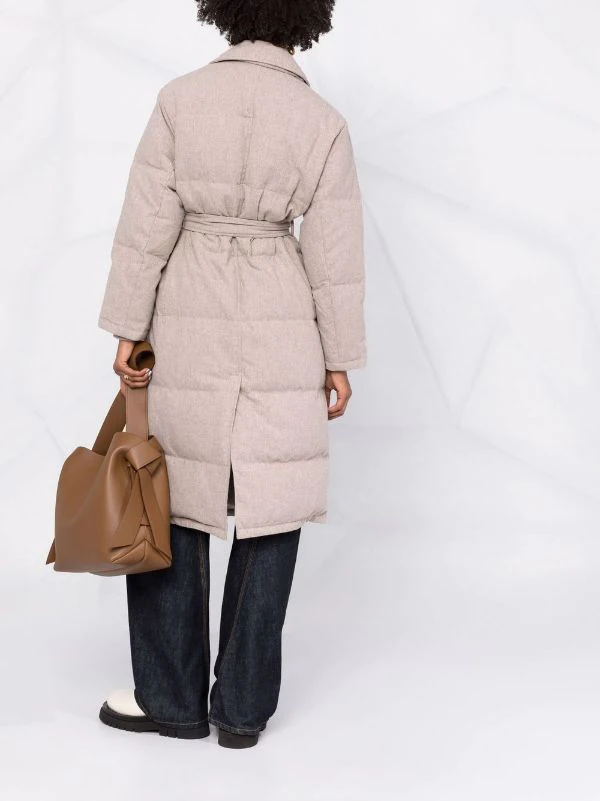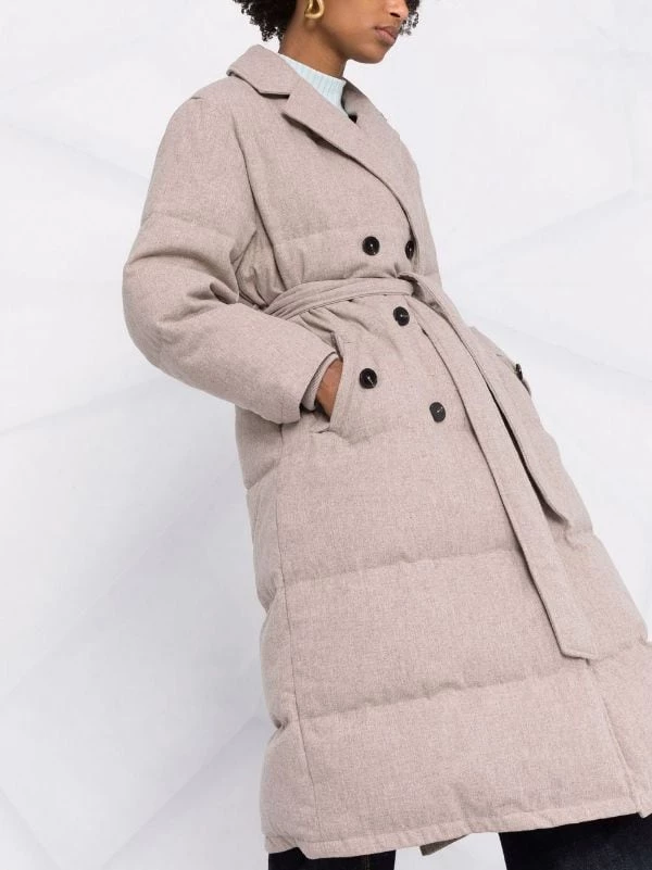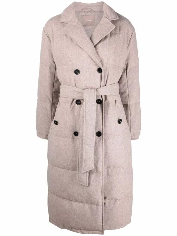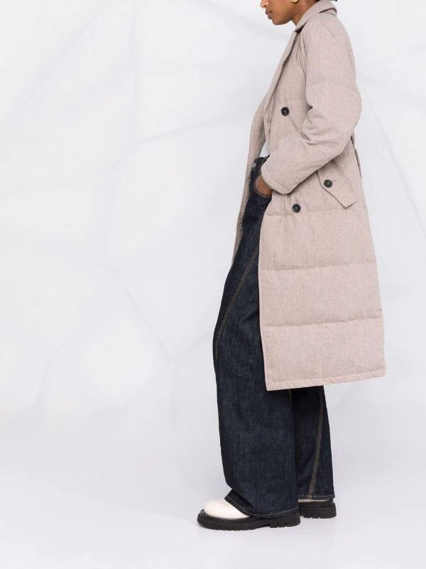 Effet matelassé, taille ceinturée, boutonnière croisée, col cranté, manches longues, coupe longue, ourlet droit, design matelassé.
