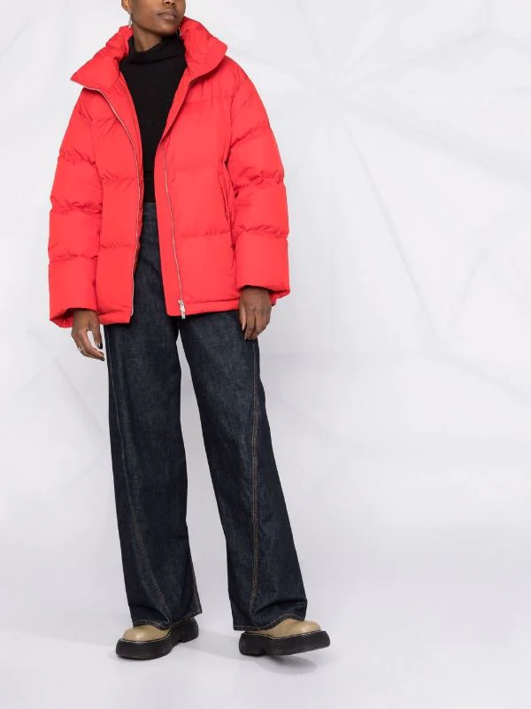 Design matelassé, design matelassé, col montant, fermeture zippée devant, garnissage en duvet. Couleur : rouge.