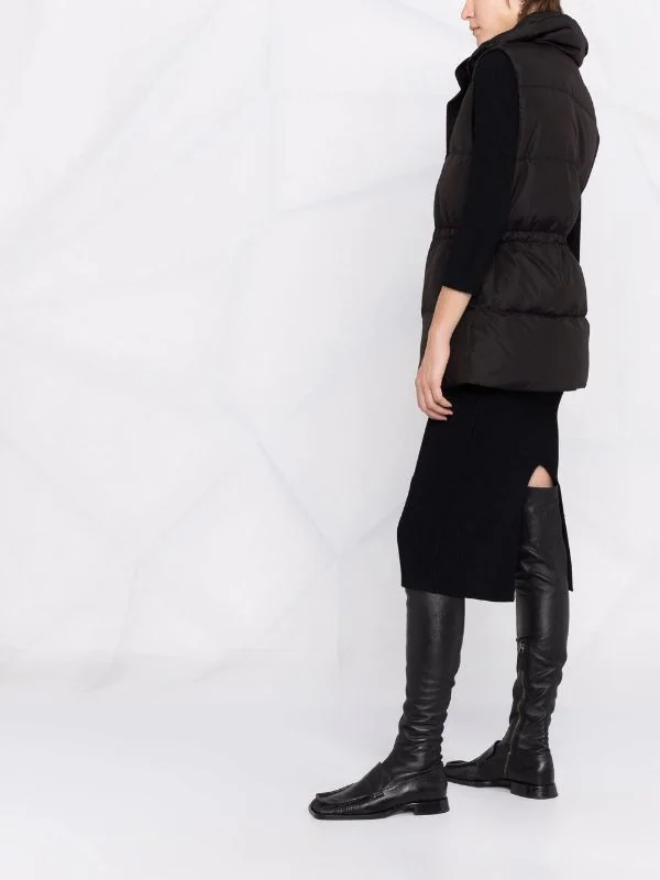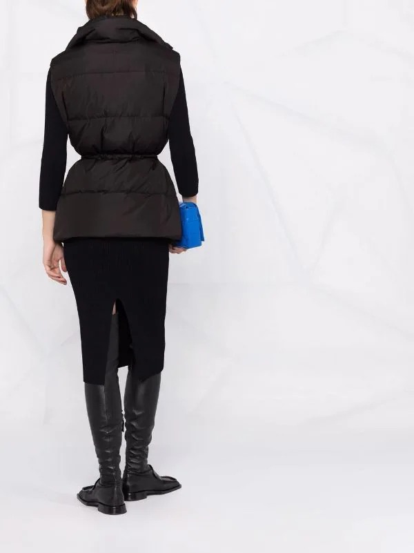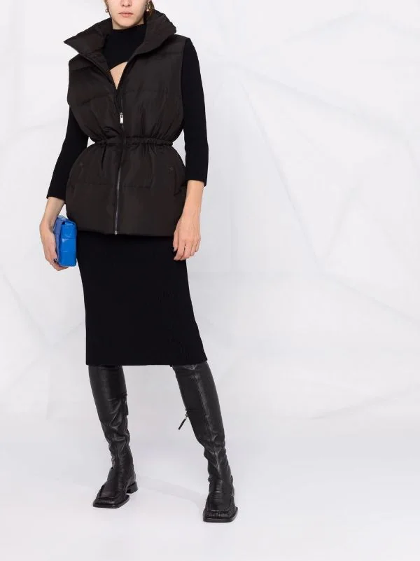 Col montant, fermeture zippée devant, deux poches latérales boutonnées, design sans manches. Couleur : noir. Matière : duvet.