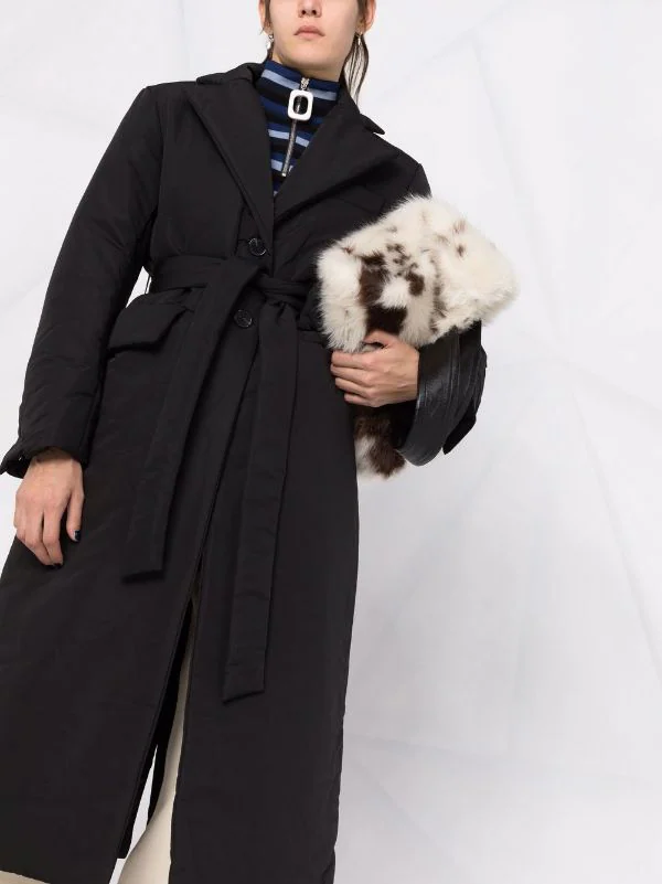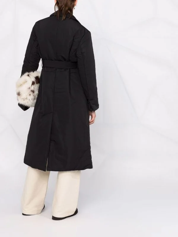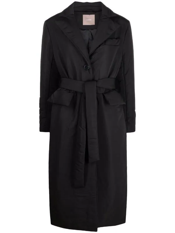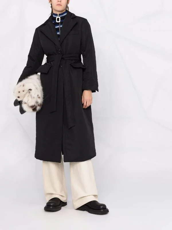 Design matelassé, taille ceinturée, col cranté, deux poches à rabat sur le devant, poche passepoilée sur la poitrine, boutonnière sur le devant, fente arrière centrale, ourlet droit. Couleur : noir.