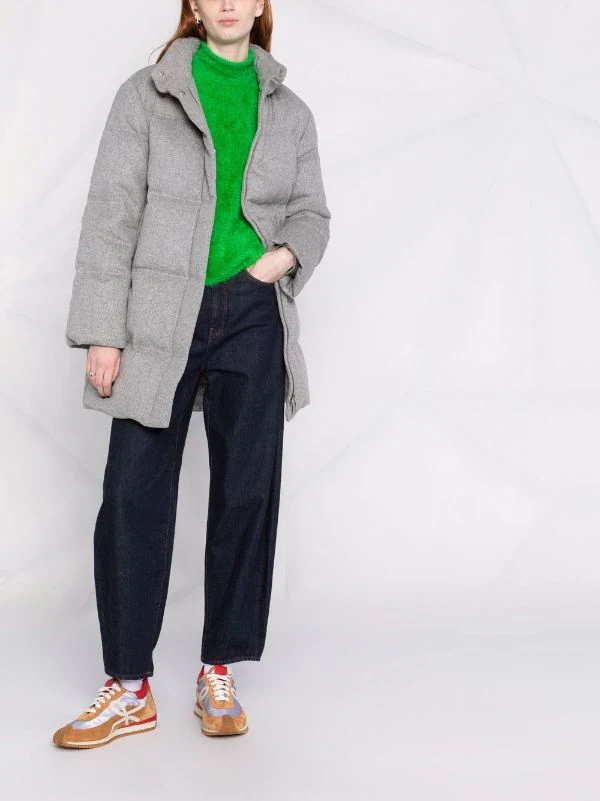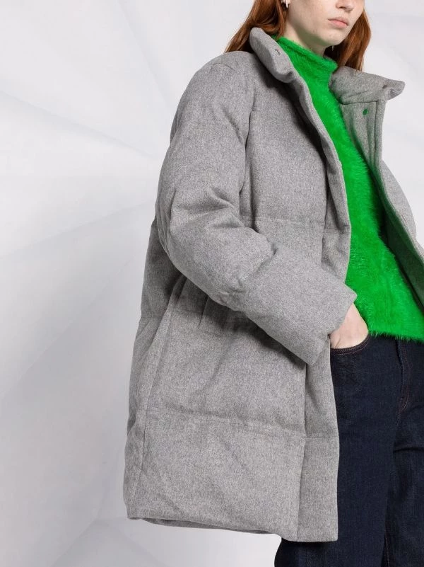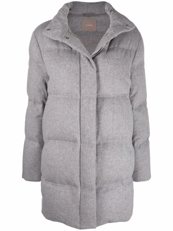 Garnissage en duvet, design matelassé, col cheminée, fermeture dissimulée sur le devant, bouton pression et fermeture zippée sur le devant, manches longues, deux poches passepoilées latérales. Couleur : gris. Matière : laine.
