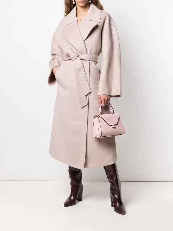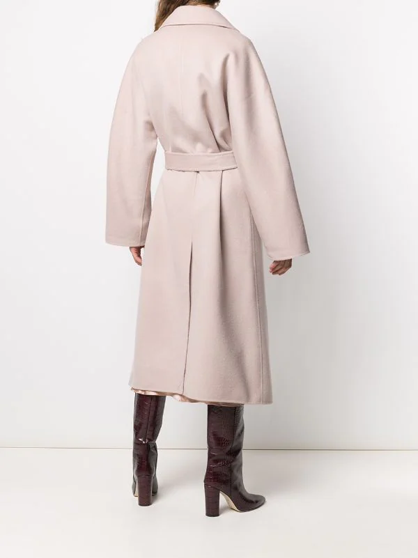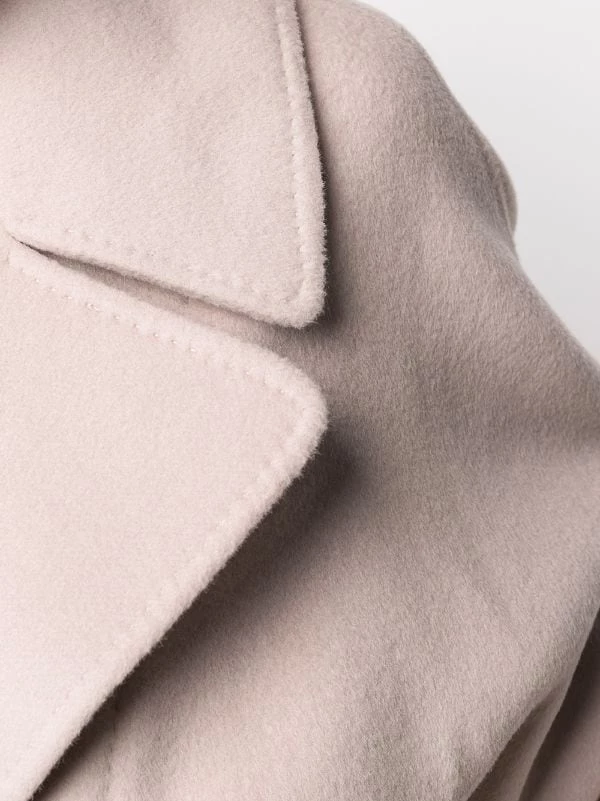 Revers crantés, taille ceinturée, deux poches passepoilées avant, manches longues, fente arrière, ourlet droit. Matière : laine.
