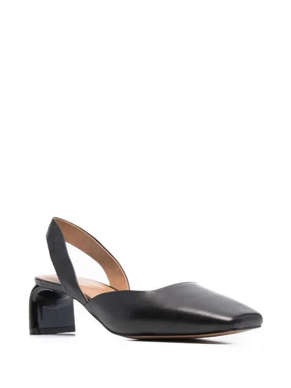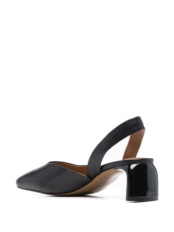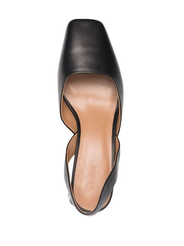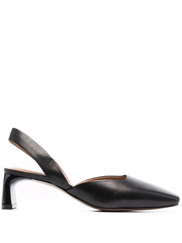 Bride arrière, bout carré, design à enfiler, petit talon, semelle intérieure à logo. Couleur : noir. Matière : cuir.