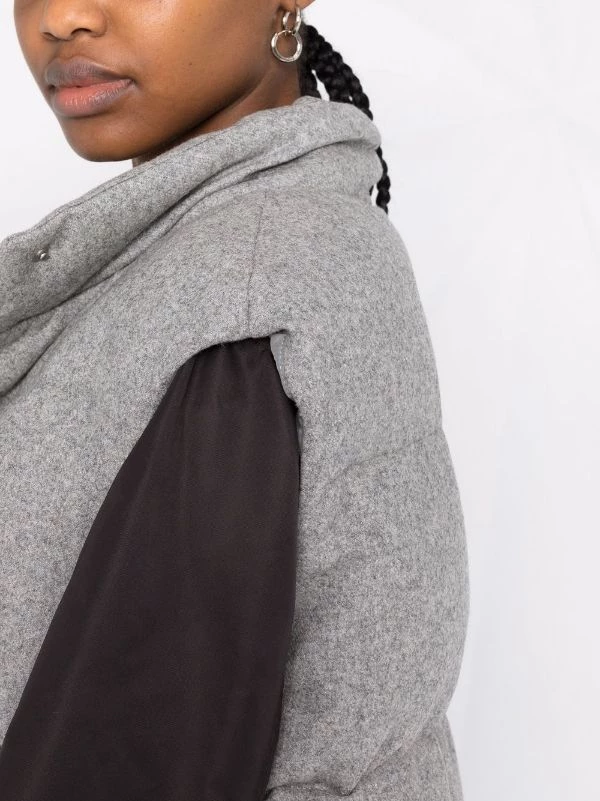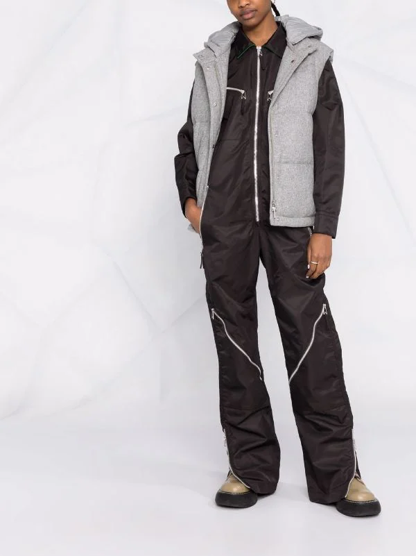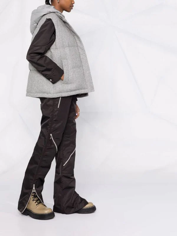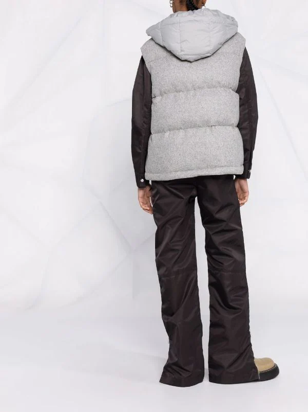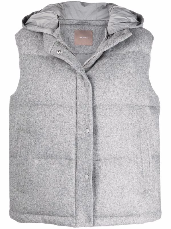 Design matelassé, capuche détachable, bouton pression et fermeture zippée sur le devant, deux poches passepoilées avant, design sans manches, ourlet droit. Couleur : gris.