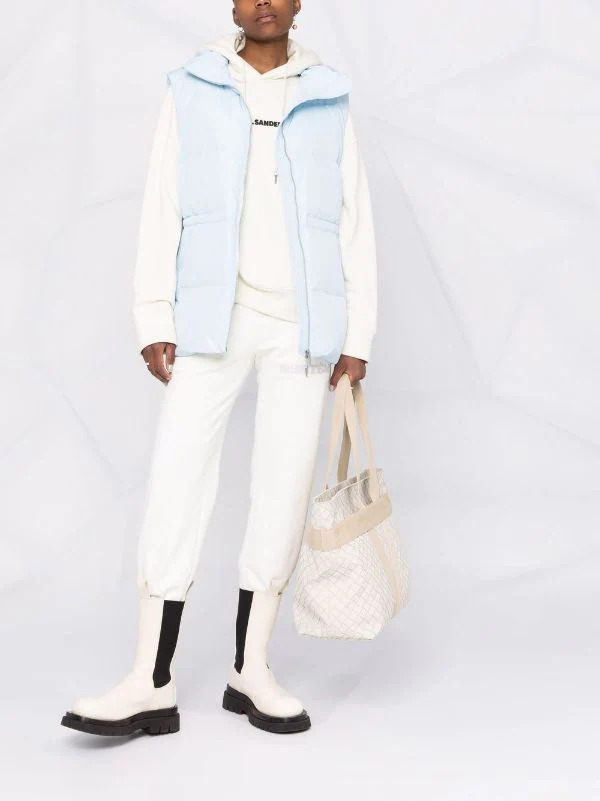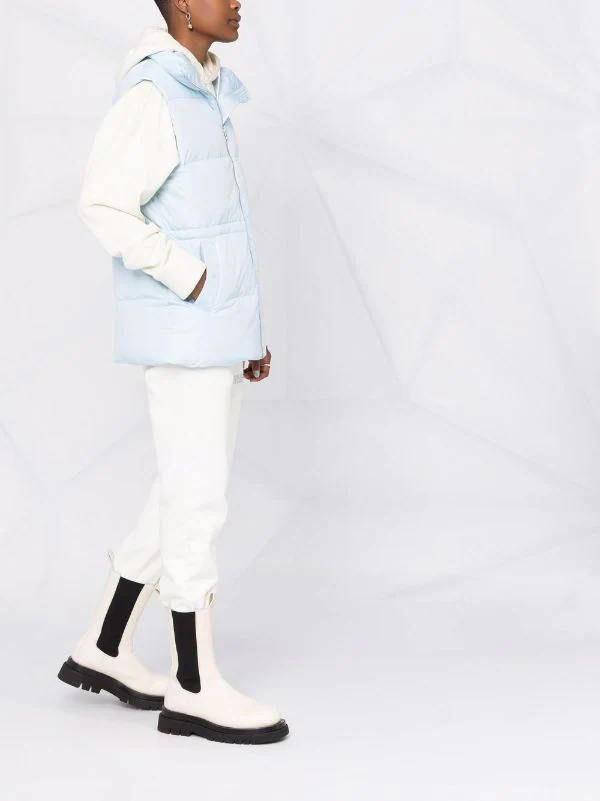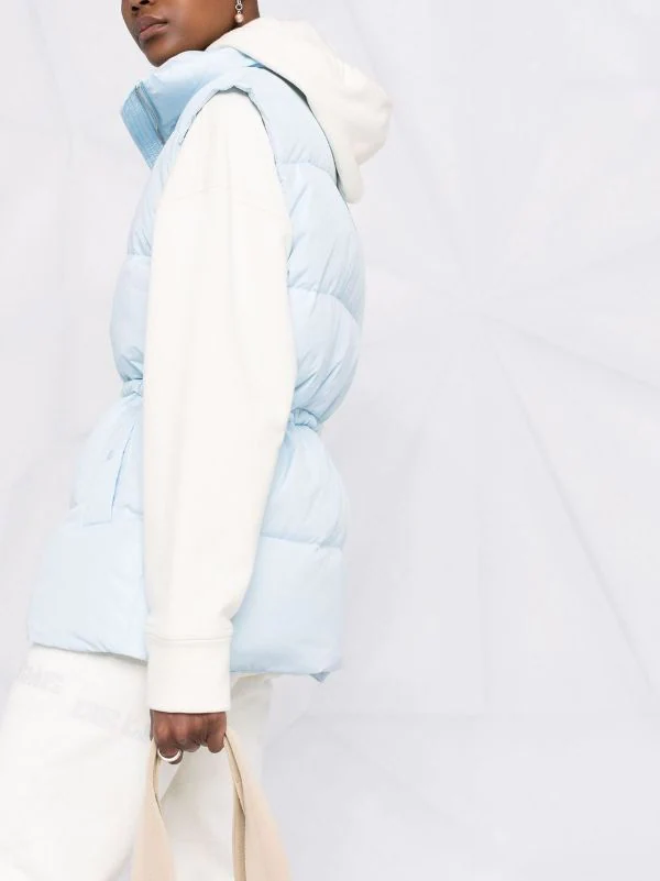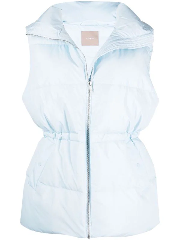 Garnissage en duvet, col cheminée, taille à lien de resserrage, fermeture zippée devant, design sans manches, deux poches latérales à bouton pression, revêtement imperméable.